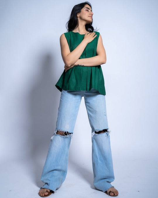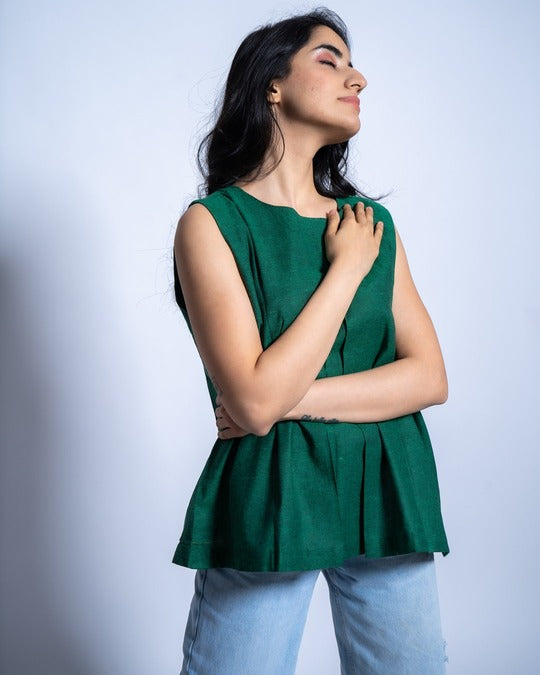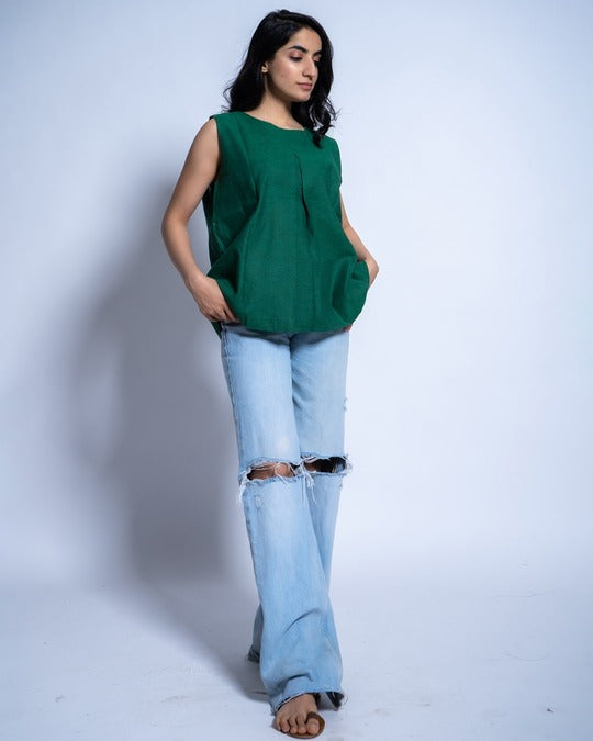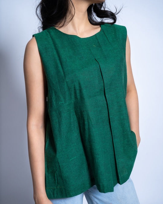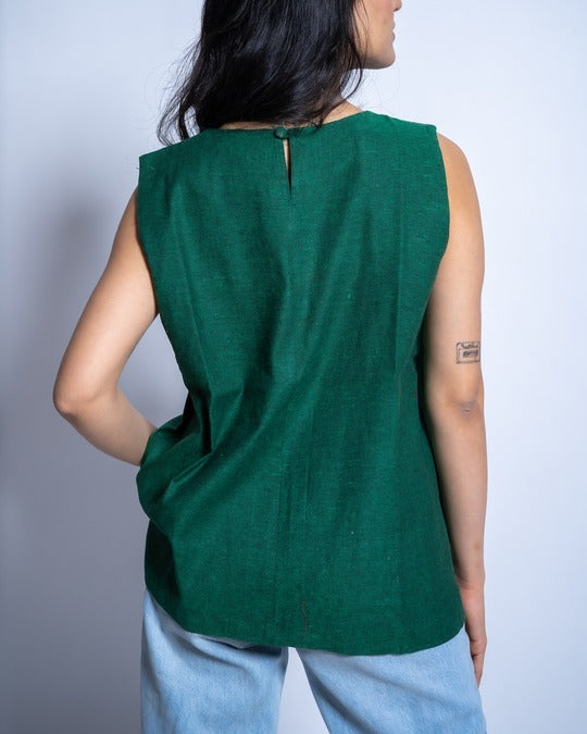 An easy sleeveless top in lightweight cotton. Single inverted pleat in the front. Blanket stitch detailing around the neckline and armhole.
