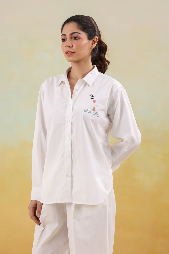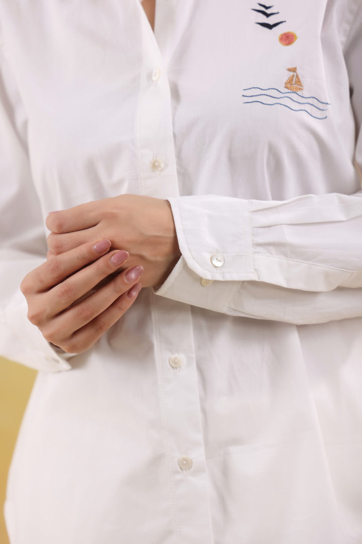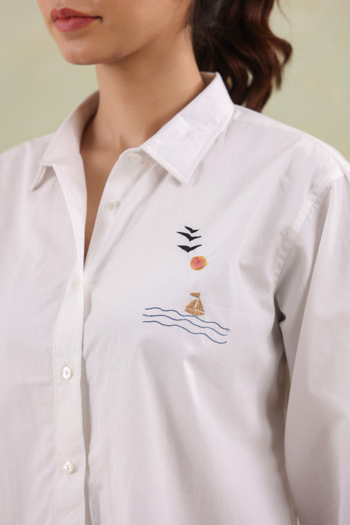 Sail into style: Crisp white shirt dotted with playful waves, boats, and suns for a breezy, casual look.