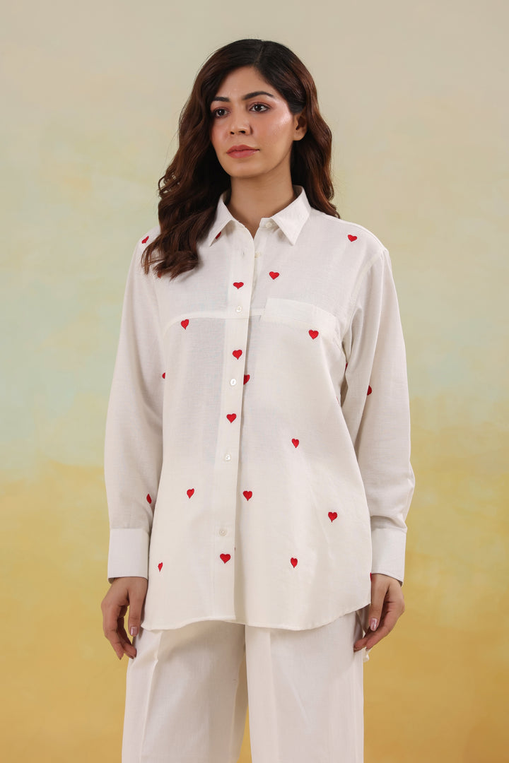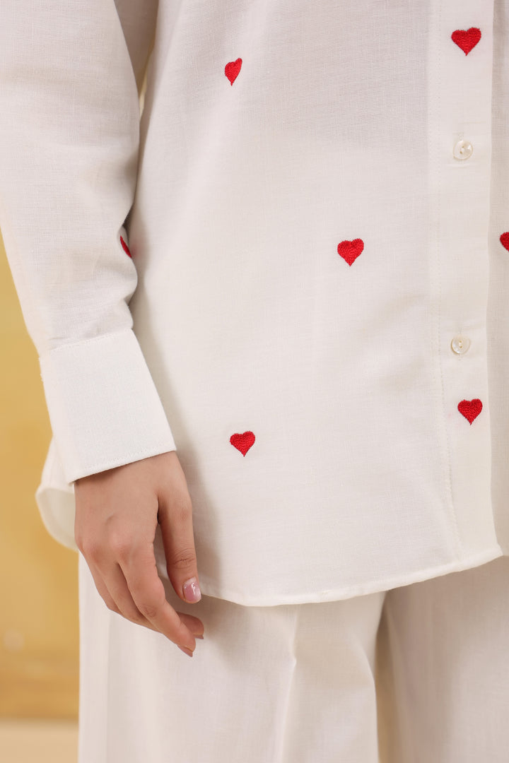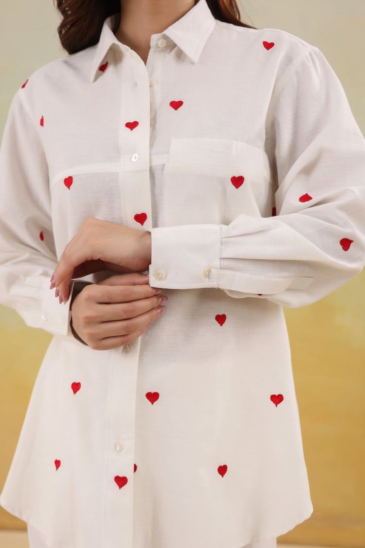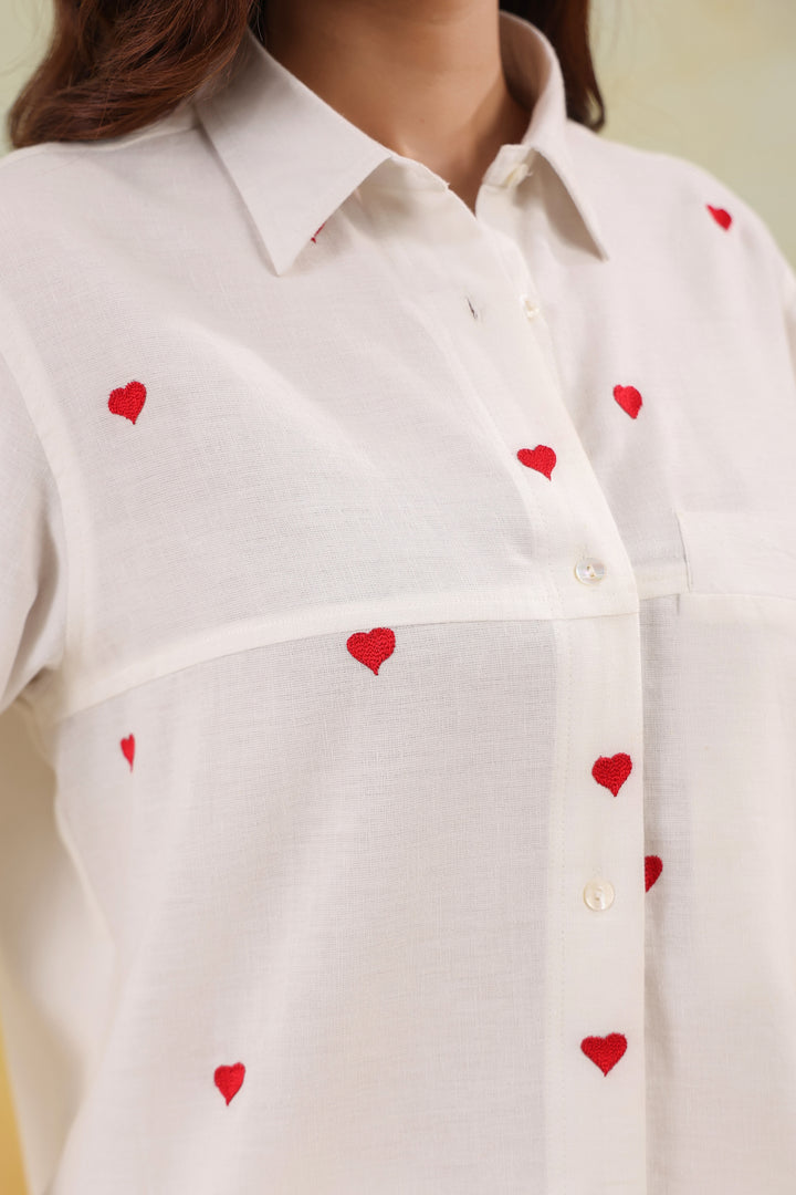 Crisp white, playful red hearts—all-over print for a fun, stylish vibe. Perfect for casual, everyday chic.