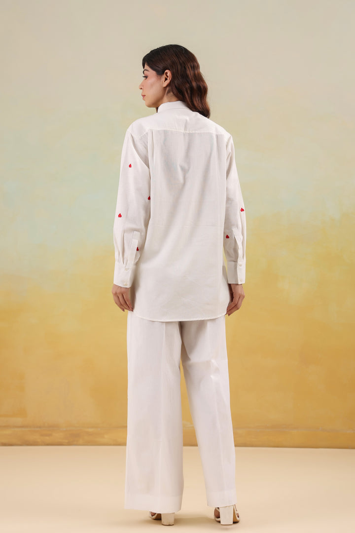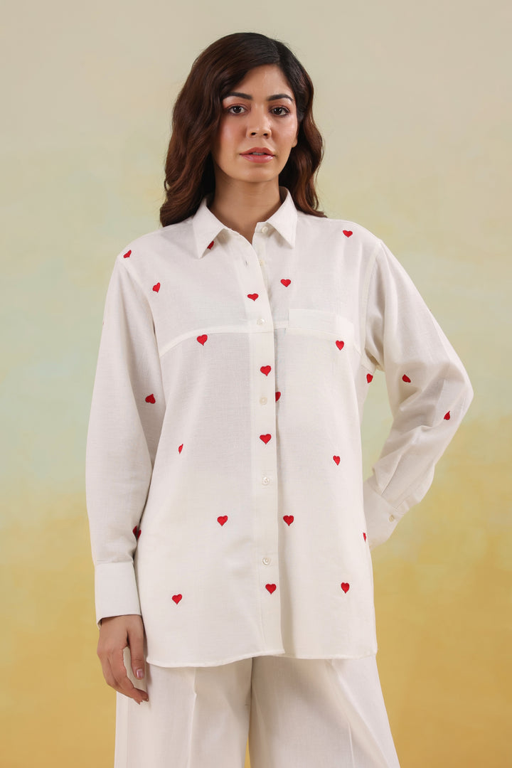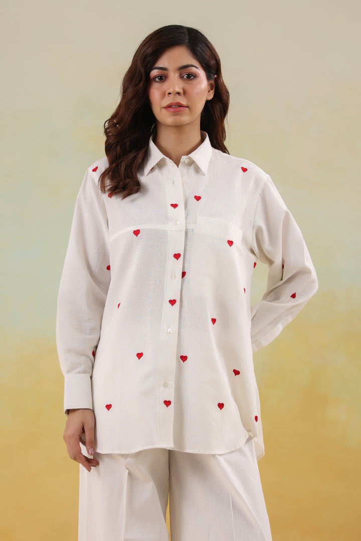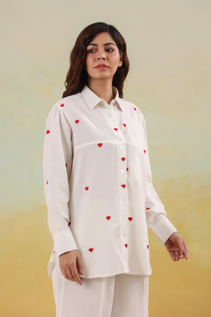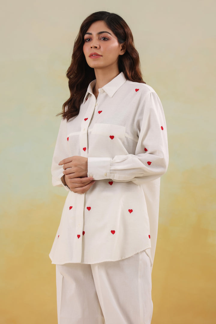 Crisp white, playful red hearts—all-over print for a fun, stylish vibe. Perfect for casual, everyday chic.