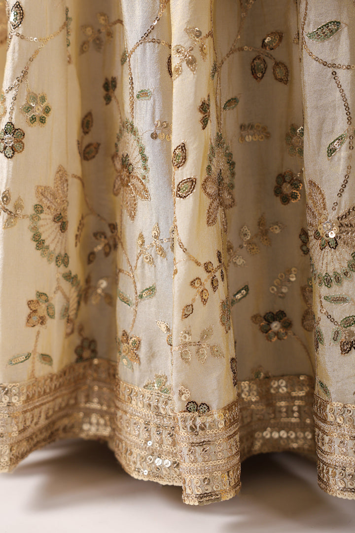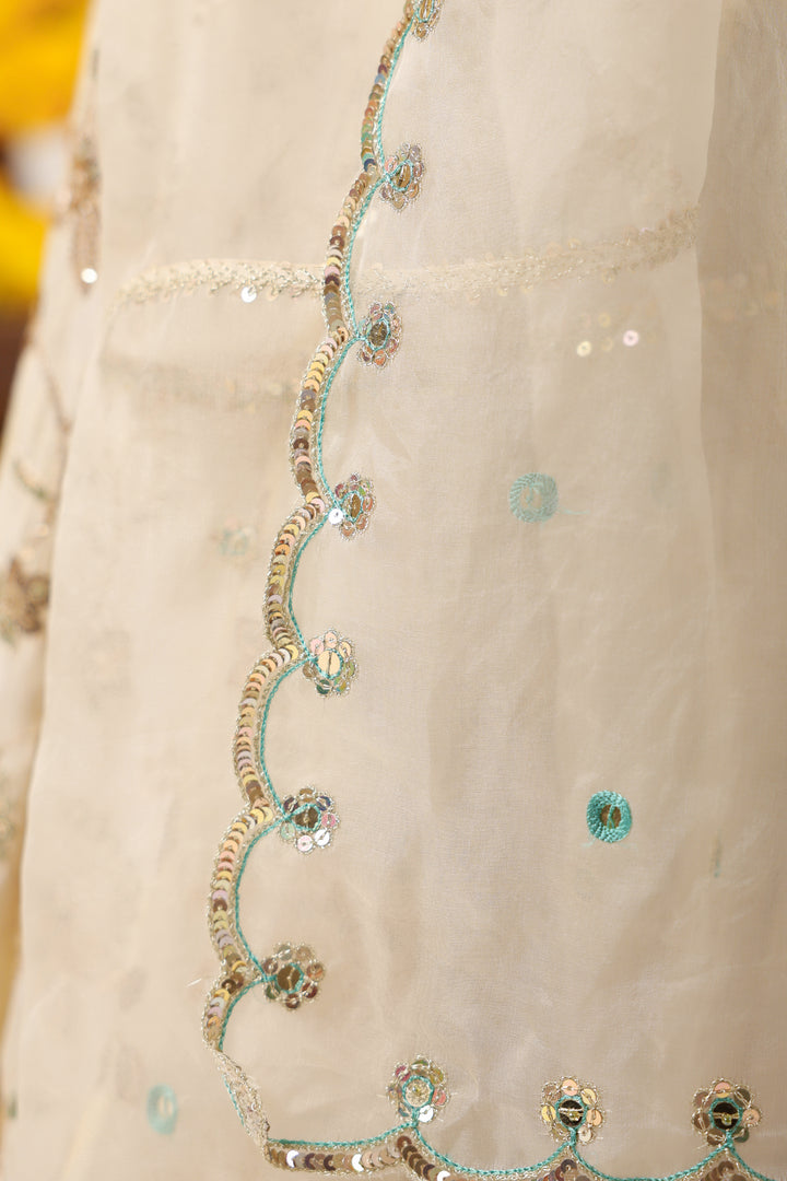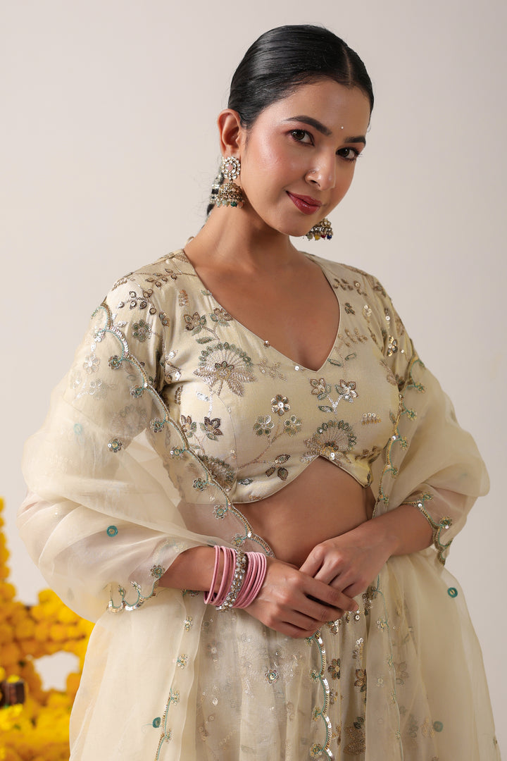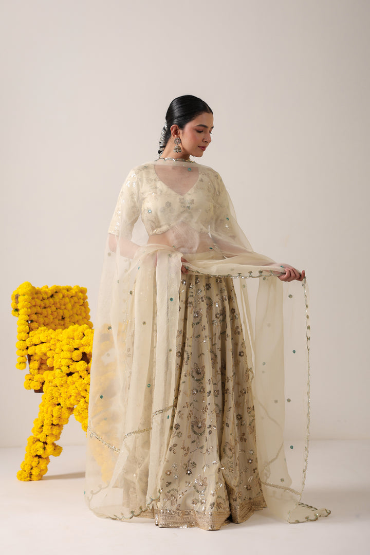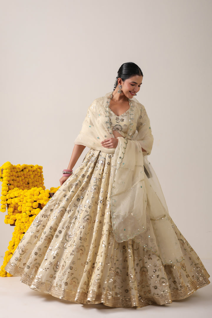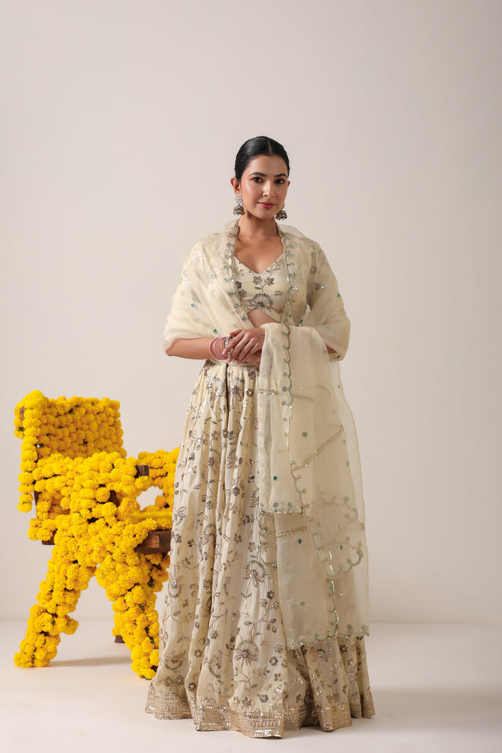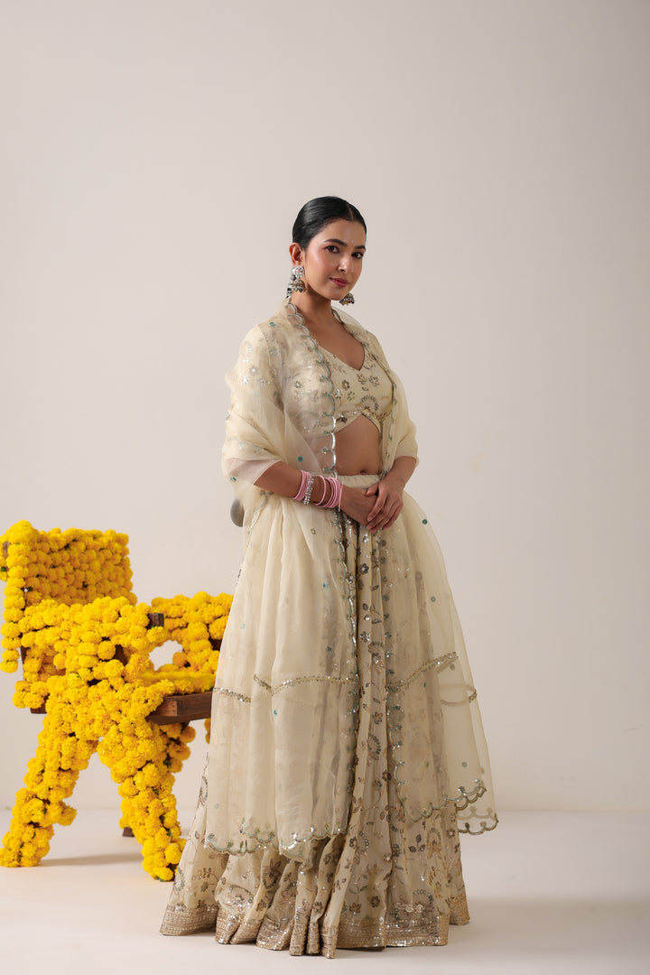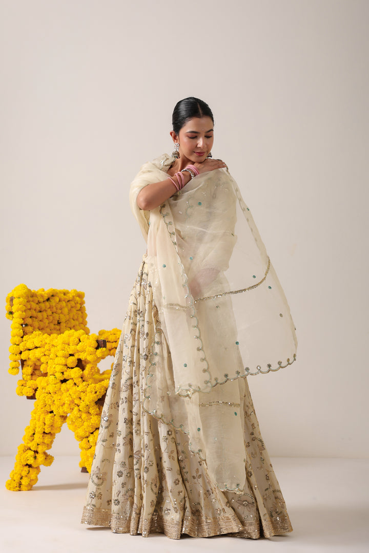 Ethereal Ivory Elegance : Grace takes center stage in this ivory lehenga and blouse crafted from luxurious raw silk, adorned with delicate all-over boota work that speaks of timeless artistry. The subtle sheen of raw silk enhances the richness of every motif, while the structured silhouette ensures a regal presence. Paired with a pure organza dupatta, embroidered along the borders and sprinkled with dainty bootas across its expanse, the ensemble exudes understated grandeur. Light, airy, and effortlessly sophisticated—this lehenga is the perfect blend of tradition and modern elegance, designed for celebrations where quiet luxury shines the brightest.