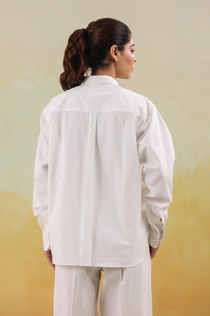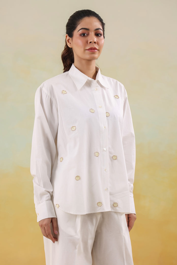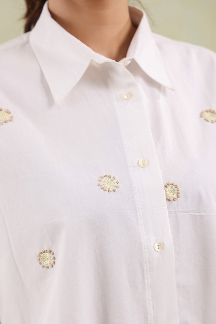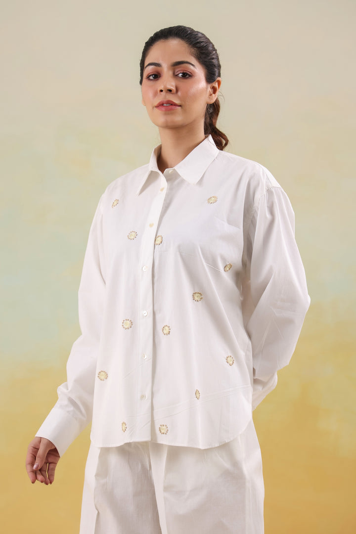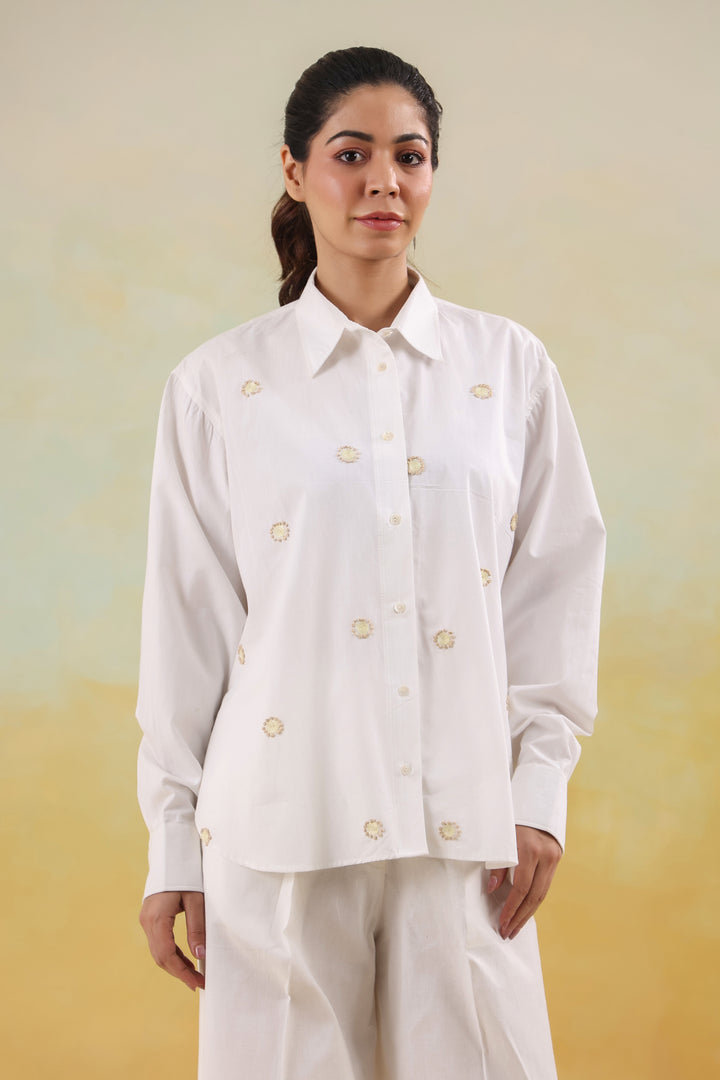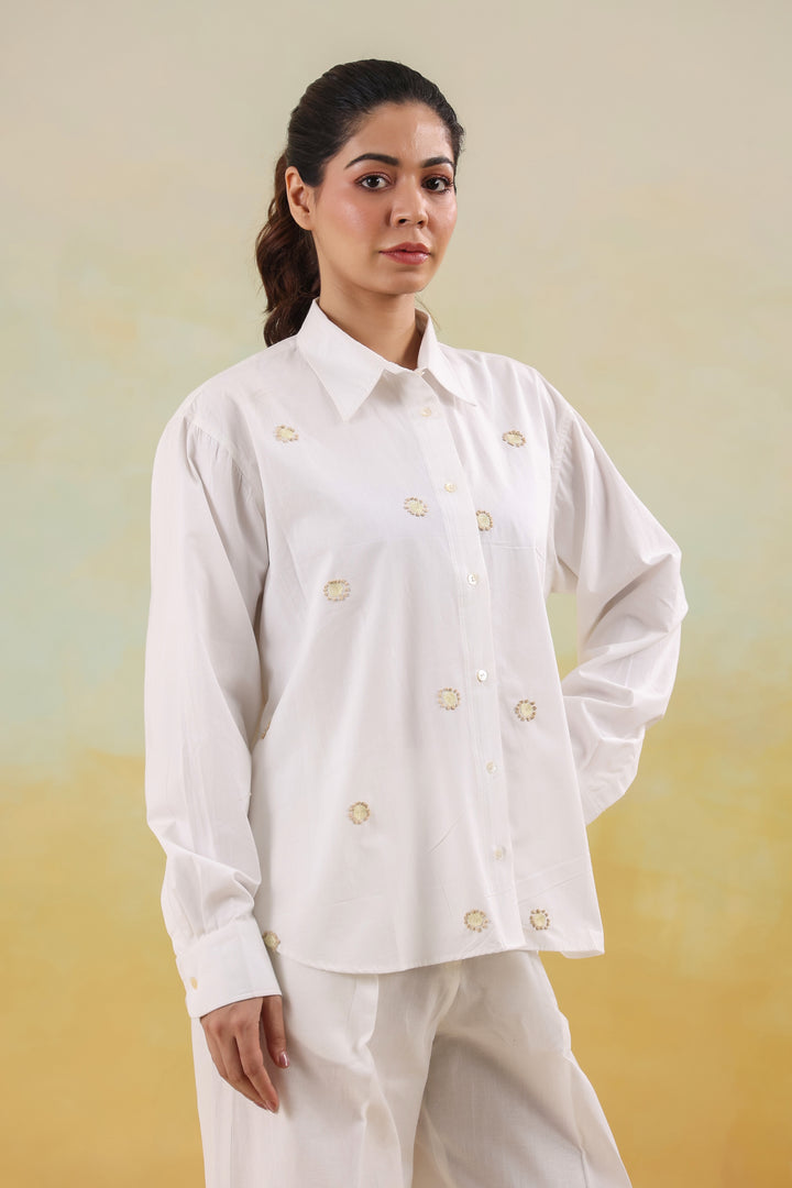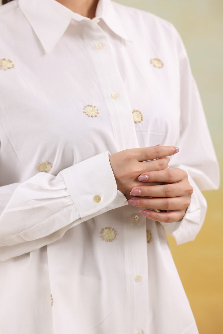 A crisp white shirt adorned with fine thread motifs, adding effortless sophistication to everyday style.