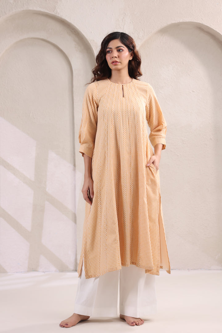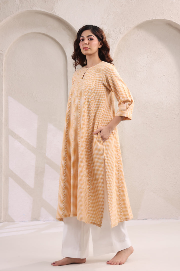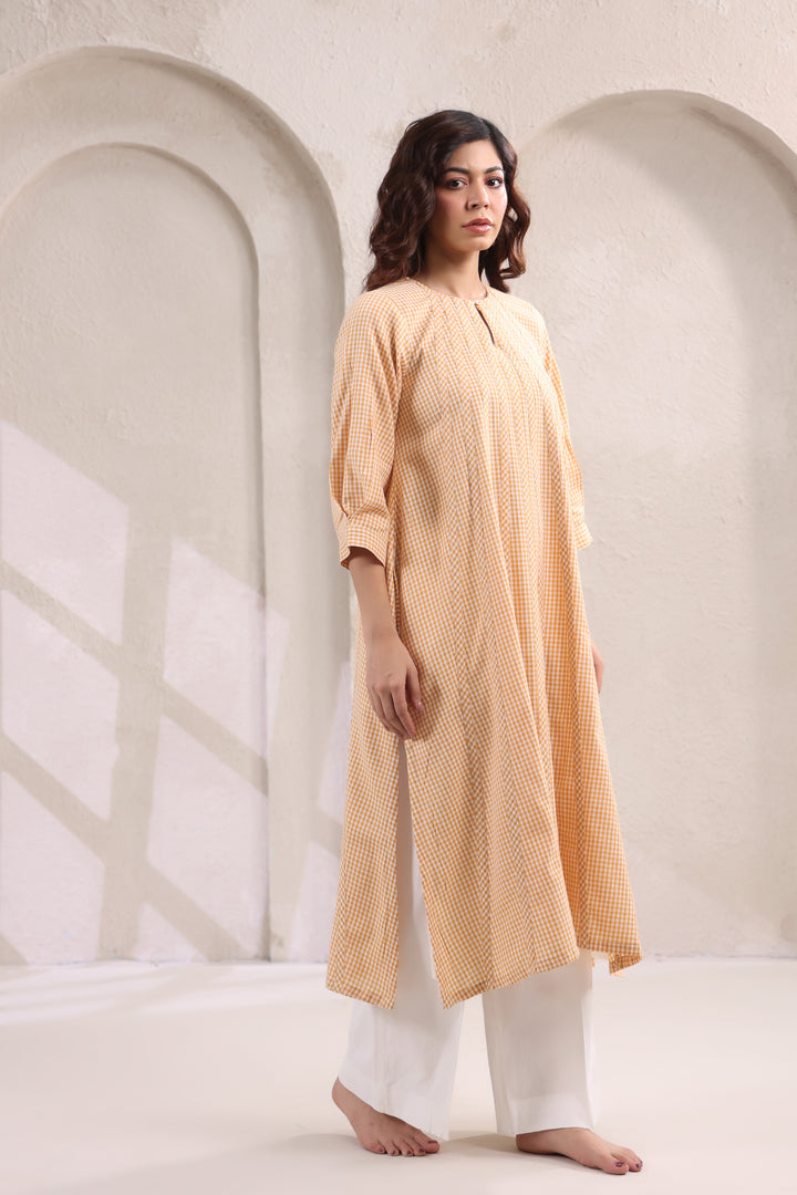 Bright, breezy, and effortlessly chic, this Anti-Fit Kurta Set in small yellow checks is the perfect blend of comfort and style. The anti-fit silhouette offers a relaxed, flowy shape that flatters all body types, while the cheerful yellow checks bring a playful yet refined charm. Paired with crisp white bottoms, this set creates a fresh and versatile look that works beautifully for casual outings, workdays, or laid-back festive wear. Light, breathable, and easy to carry, it’s designed to keep you comfortable while making a subtle style statement. Key Features: Anti-fit kurta for a relaxed, airy silhouette.
