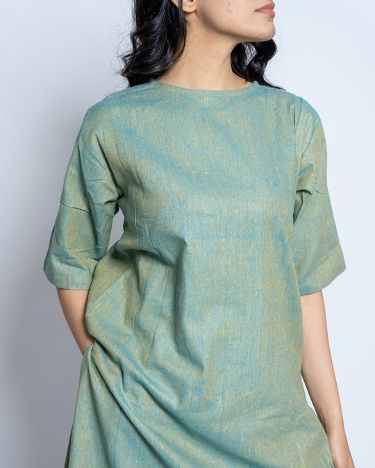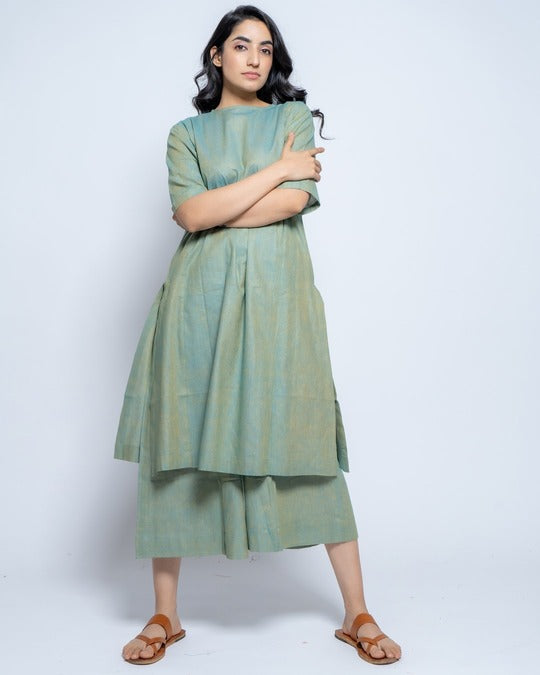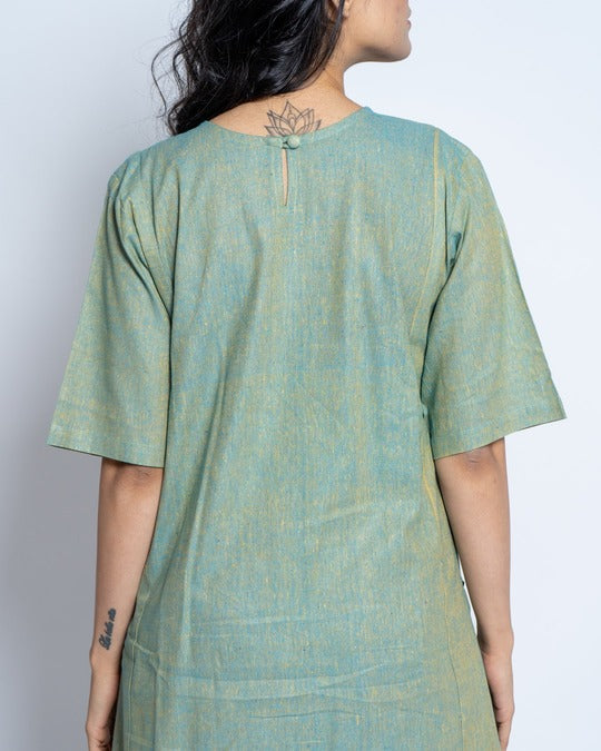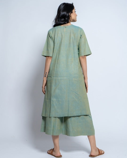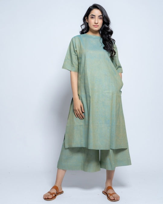 Handsome Co-Ord set designed for 9 am to 9 pm ease. Subtle round neck. Placket with a single button reveal at neck. Stylish curved hem. In-seam pockets.