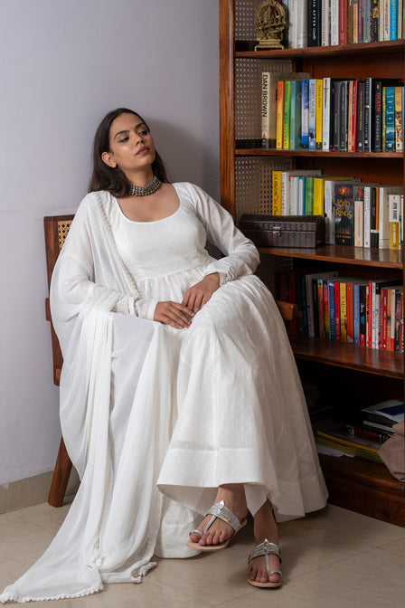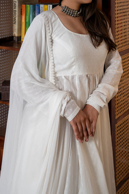 This set includes anarkali, pants and dupatta. Dupatta has lace detailing on all four sides.