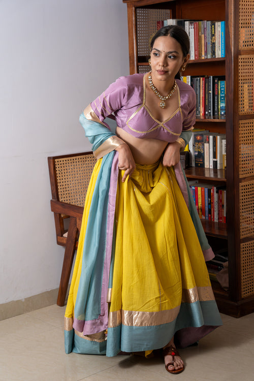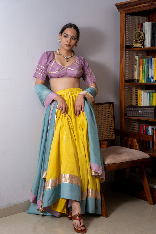 This set includes Lehenga, Aangi (Blouse) and Dupatta. Lehenga is made in pure cotton, Dupatta in summer silk and Aangi in pure silk.