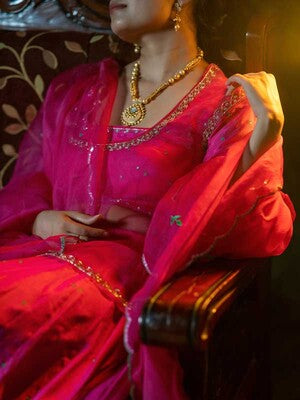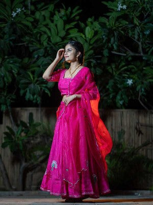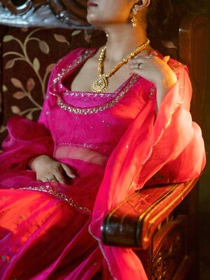 The set comes with Lehenga, Blouse, Kurti and Dupatta. Lehenga and Blouse are made in pure silk. Dupatta and Kurti are made in pure organza.