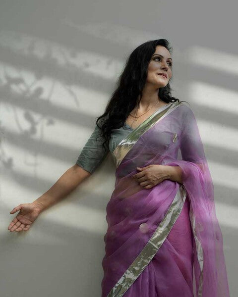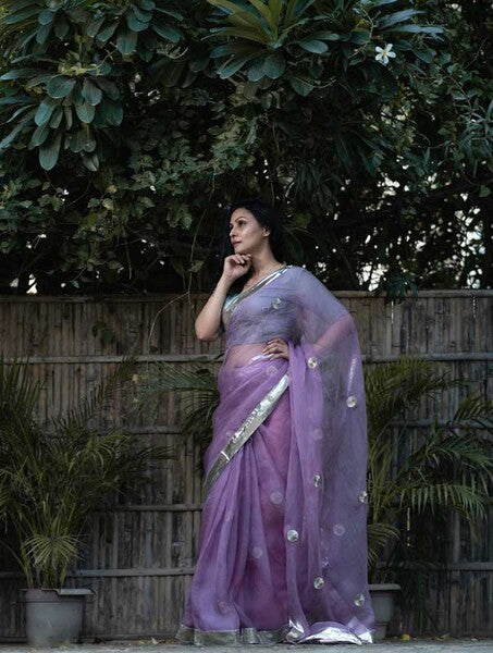 Gul Light Purple Saree made in pure organza. Highlighted with gota phool. This saree comes with a matching blouse in pure crepe.