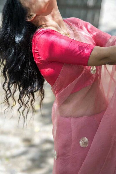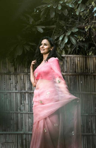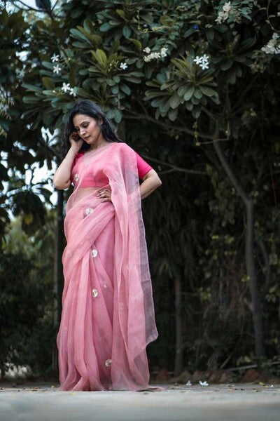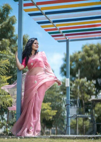 Gulabjal Light Rose Color Saree made in pure organza. Highlighted with gota phool. This saree comes with a matching blouse...
