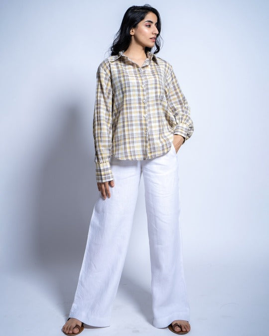 Pure cotton. A relaxed shirt with a slim collar. Front placket with button fastening. Drop shoulder with bishop sleeves. Slightly curved hemline.
