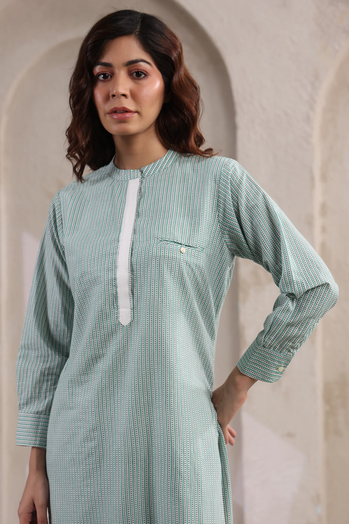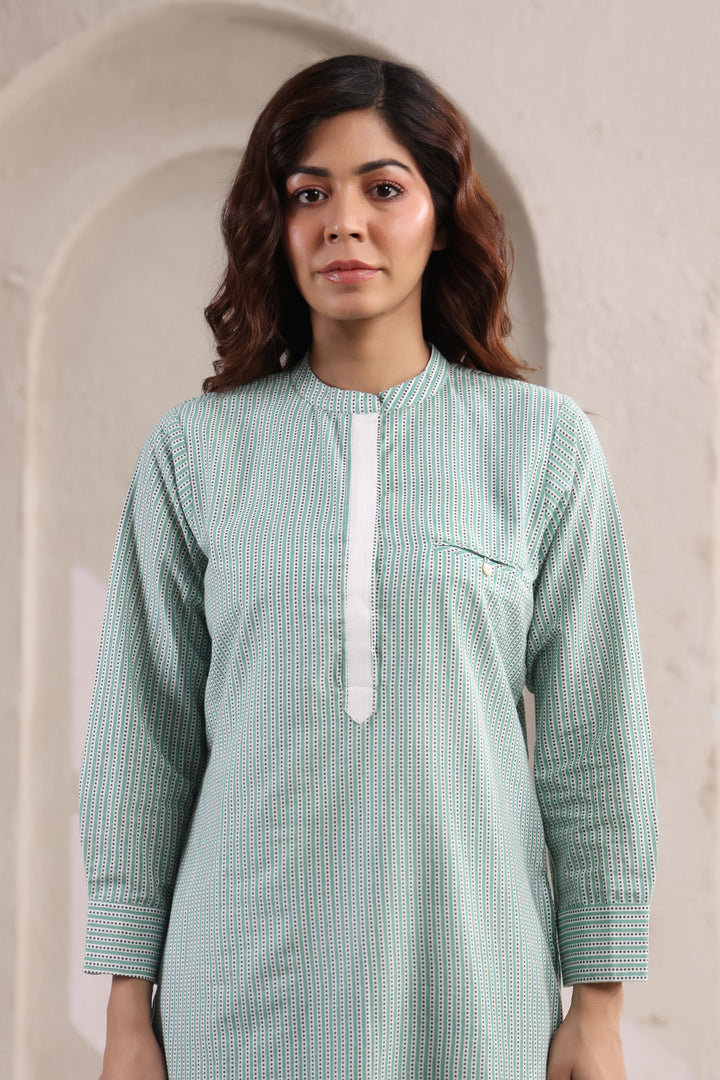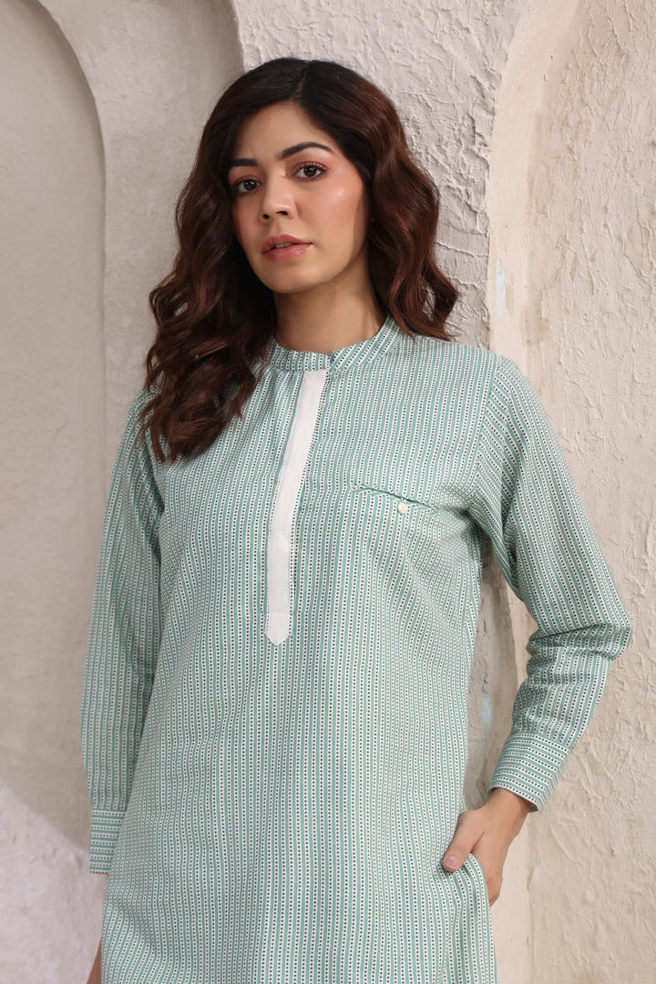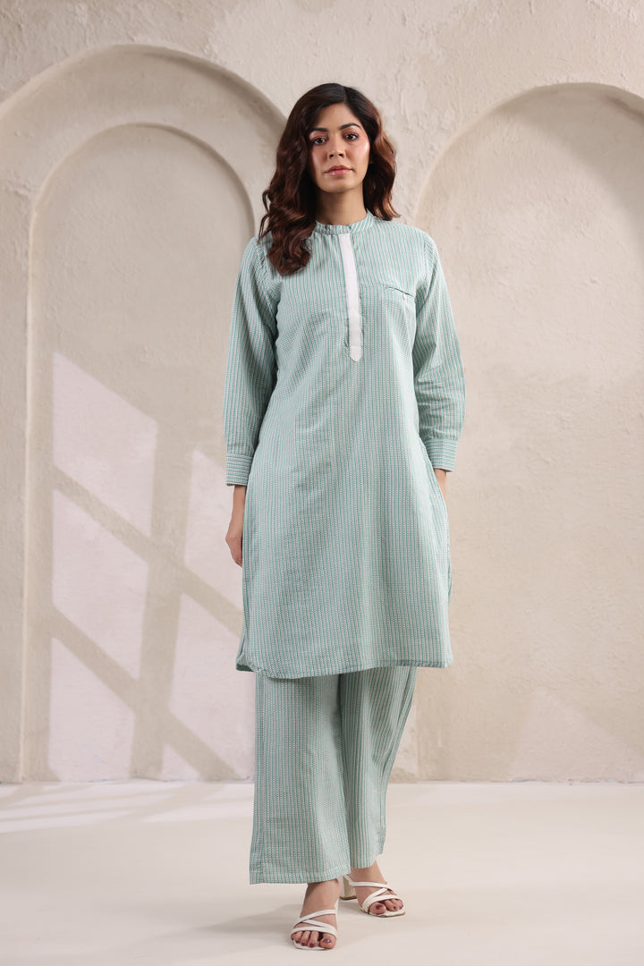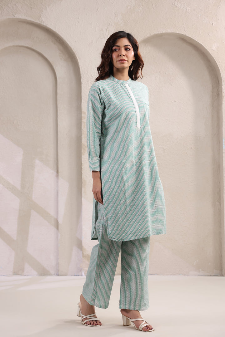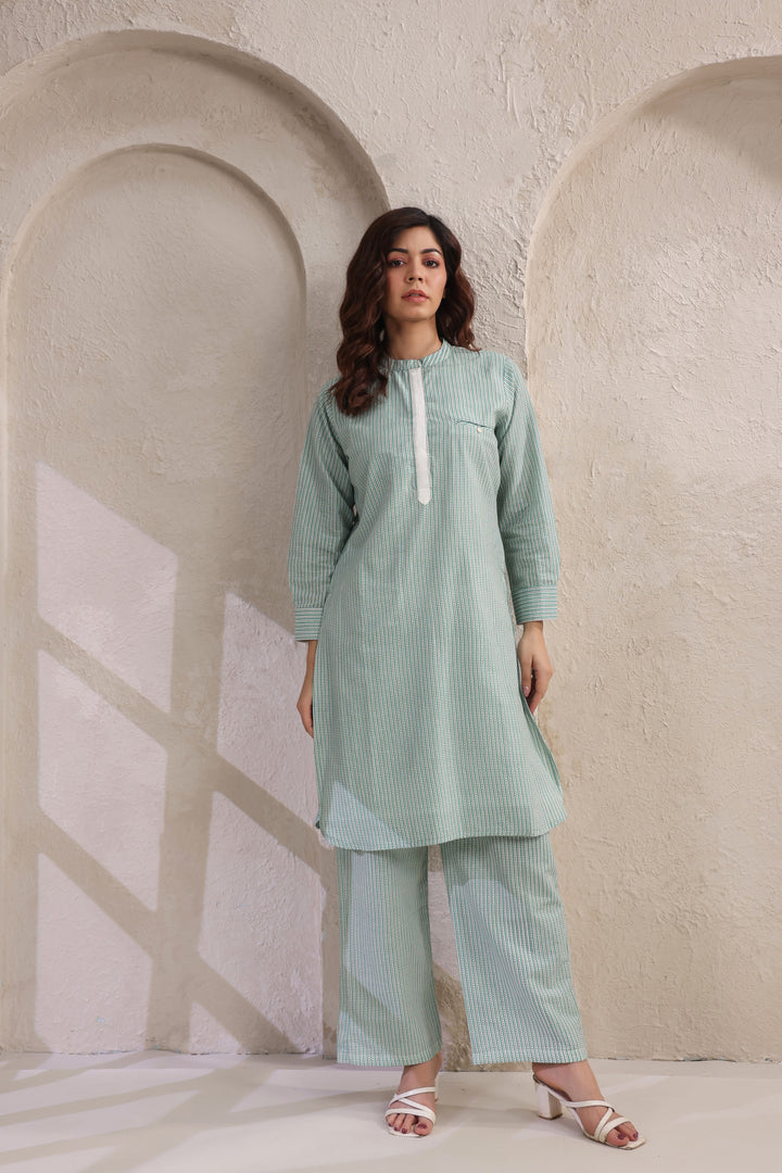 Breezy and modern, this light mint co-ord set is all about effortless elegance. Crafted in a soothing pastel hue, it brings a refreshing charm to your everyday style. The coordinated silhouette offers both comfort and versatility—easy to wear together for a chic, put-together look or mix and match for endless styling options. Perfect for brunches, travel, or relaxed evenings, this co-ord set is a must-have for a wardrobe that blends comfort with contemporary flair.