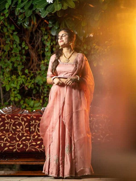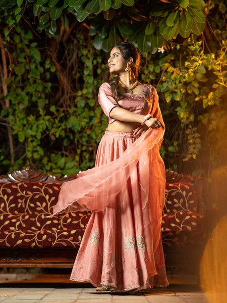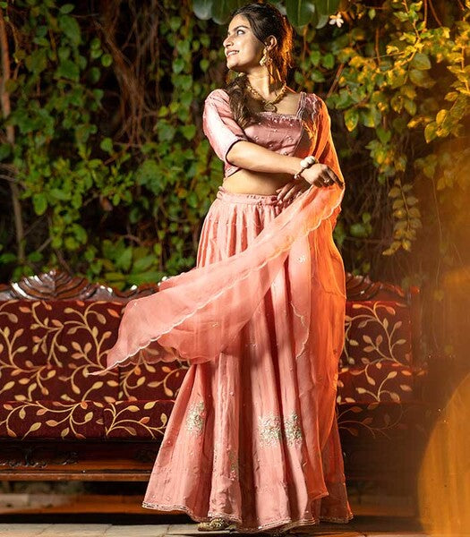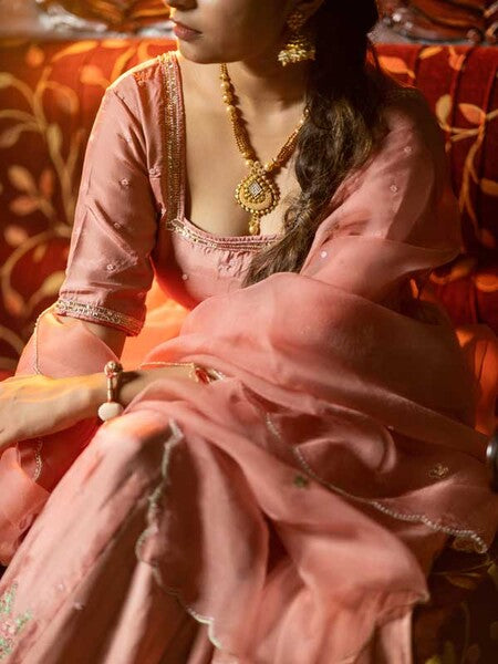 Mani Ratna Peach Lehenga Set. The set comes with Lehenga, Blouse, Kurti and Dupatta. Lehenga and Blouse are made in...
