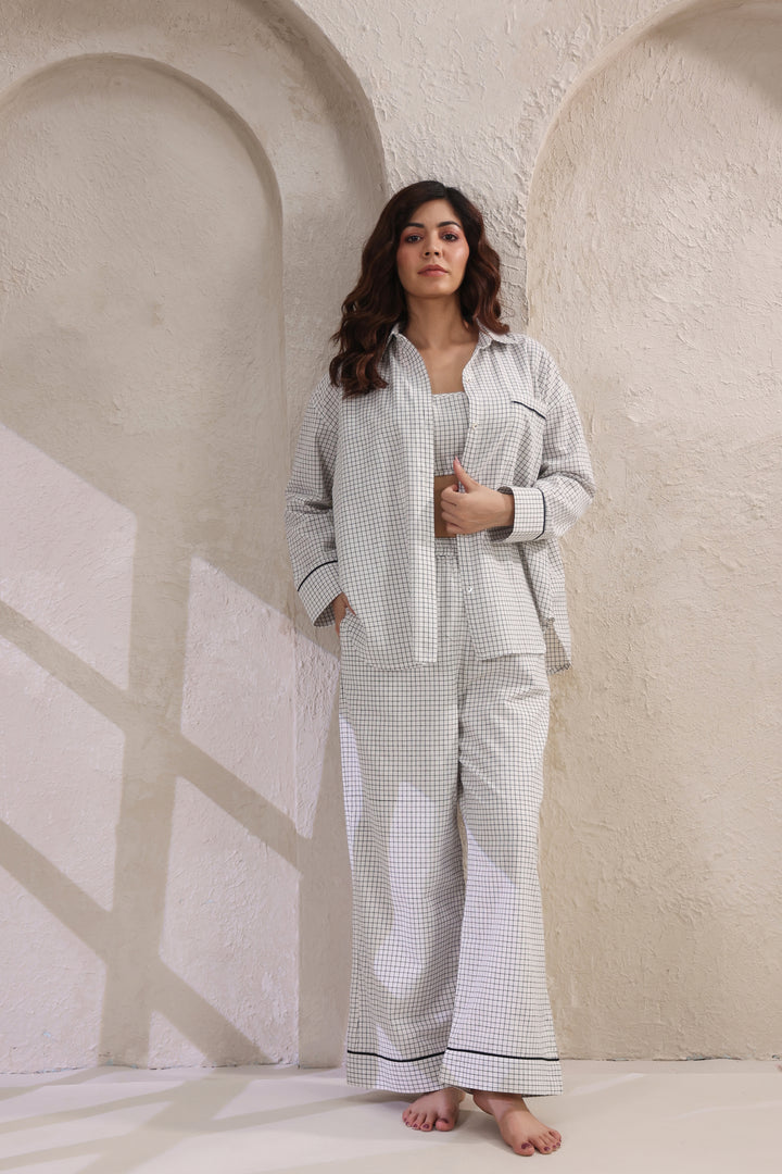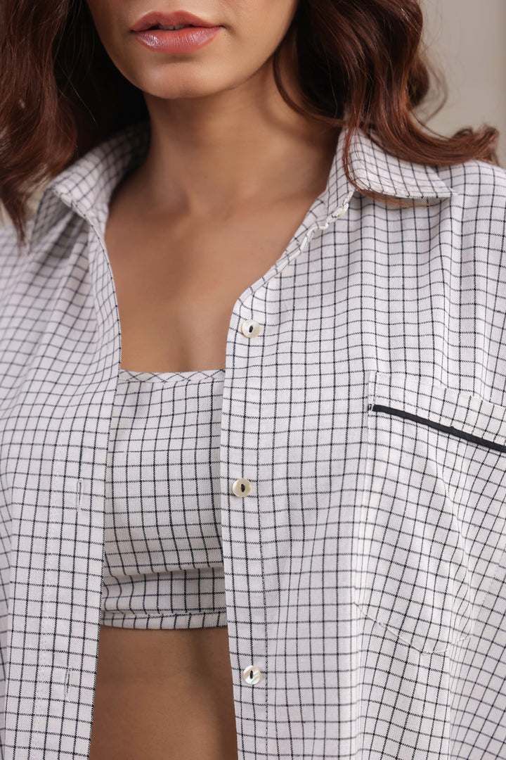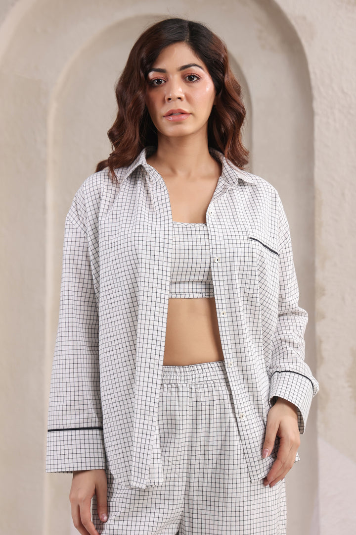 Effortless style meets everyday comfort in this relaxed fit white cotton co-ord set, detailed with subtle small checks. The three-piece ensemble includes a chic bralet, an easy button-down shirt, and relaxed pants—designed to be worn together for a coordinated look or styled separately for endless versatility. Lightweight, breathable, and modern, this set is perfect for travel, brunches, or casual evenings where comfort and style go hand in hand.