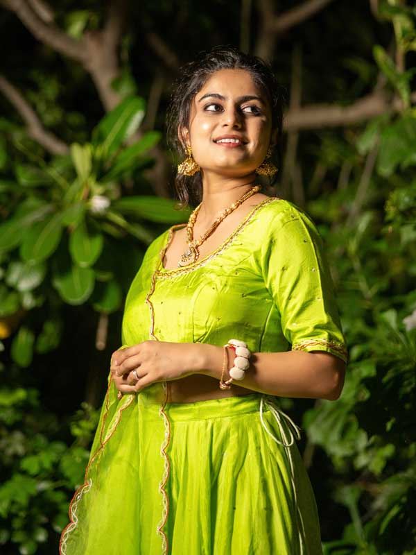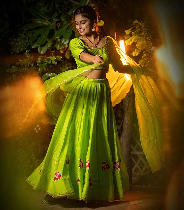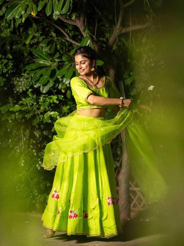 The set comes with Lehenga, Blouse, Kurti and Dupatta. Lehenga and Blouse are made in pure silk. Dupatta and Kurti are made in pure organza.