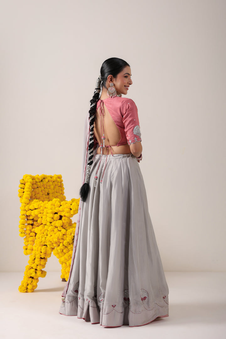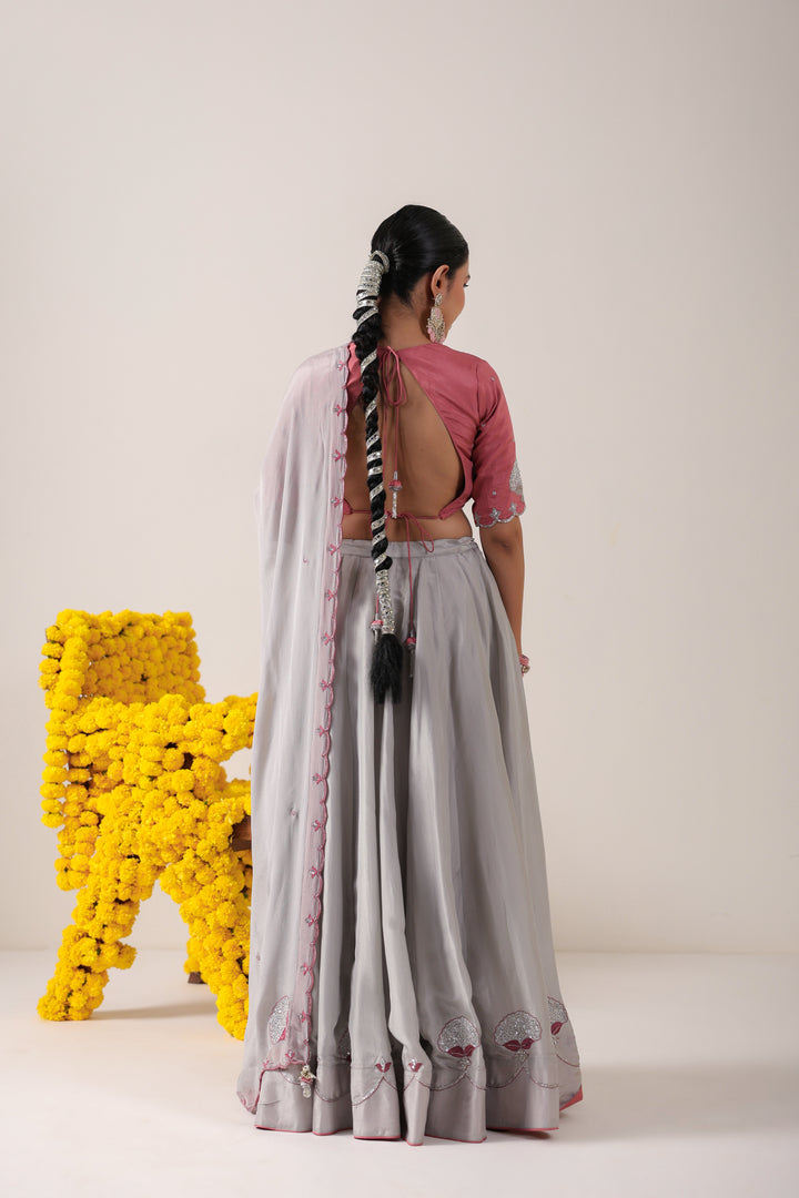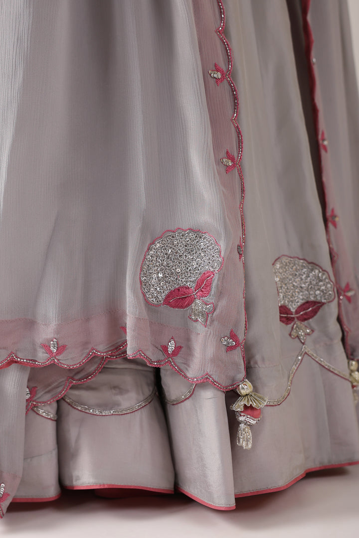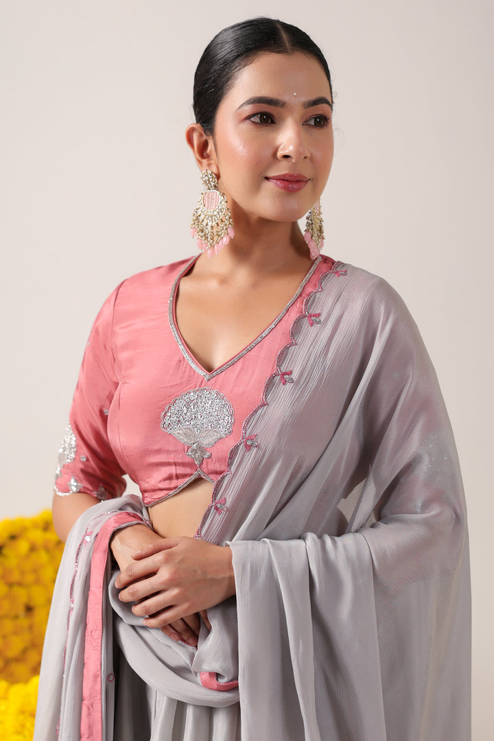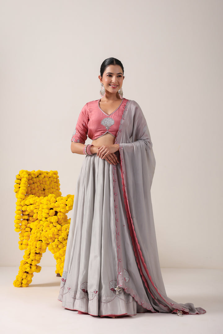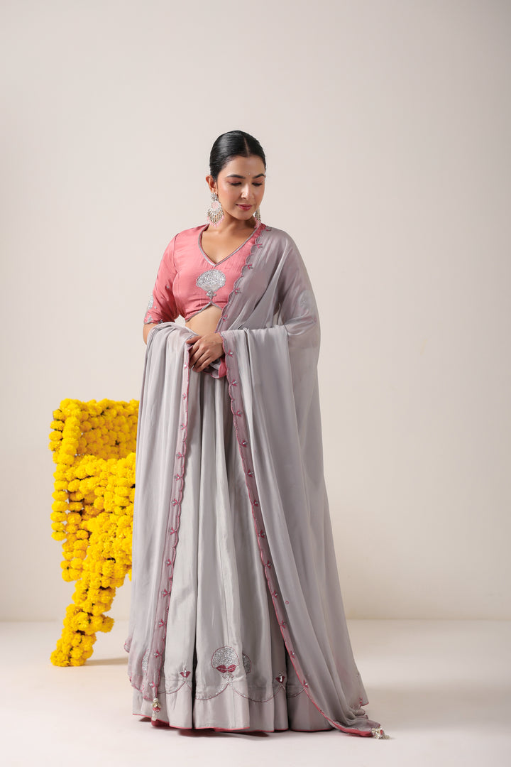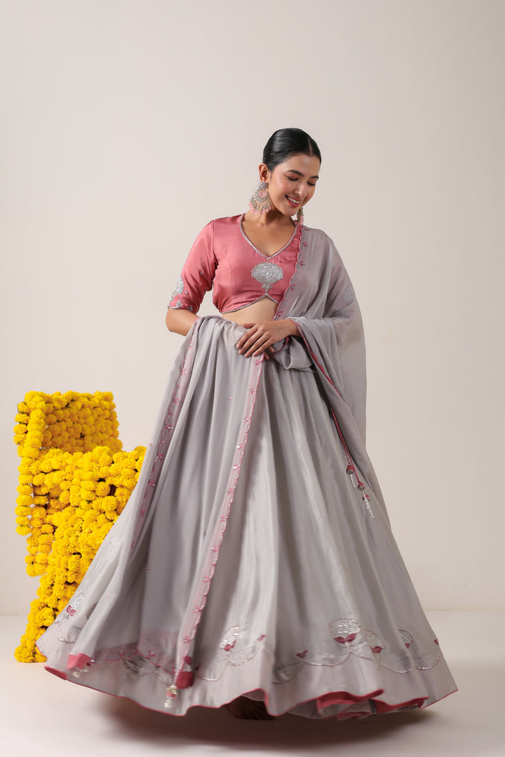 Where luxury meets artistry, this lehenga set is a vision of timeless elegance. Crafted in lustrous Upada silk, the lehenga in soft shades of pink and grey is brought to life with intricate silver handwork that sparkles like moonlight on water. The fabric’s natural sheen enhances the embroidery, creating a regal yet graceful charm. A delicately adorned Chinnon dupatta completes the ensemble, its fluid drape adding an ethereal softness to the structured silhouette. Every stitch speaks of craftsmanship, every detail whispers sophistication. Designed for those who love understated grandeur, this lehenga set is perfect for weddings, soirées, and celebrations where tradition meets modern finesse.