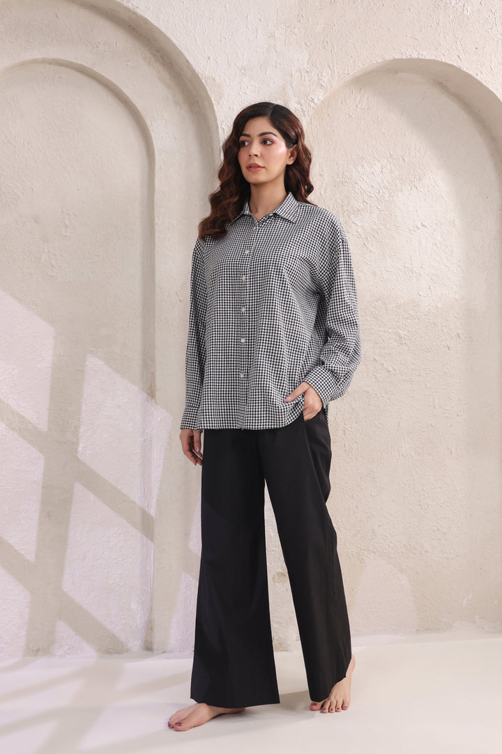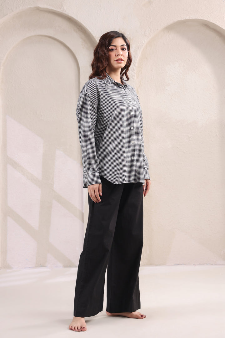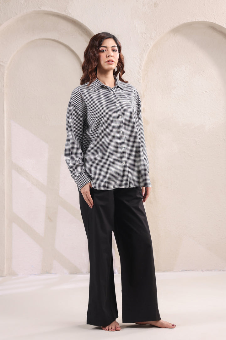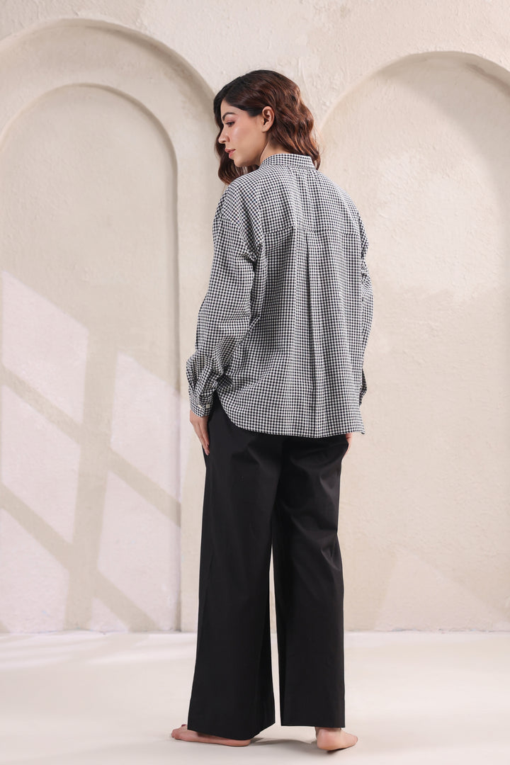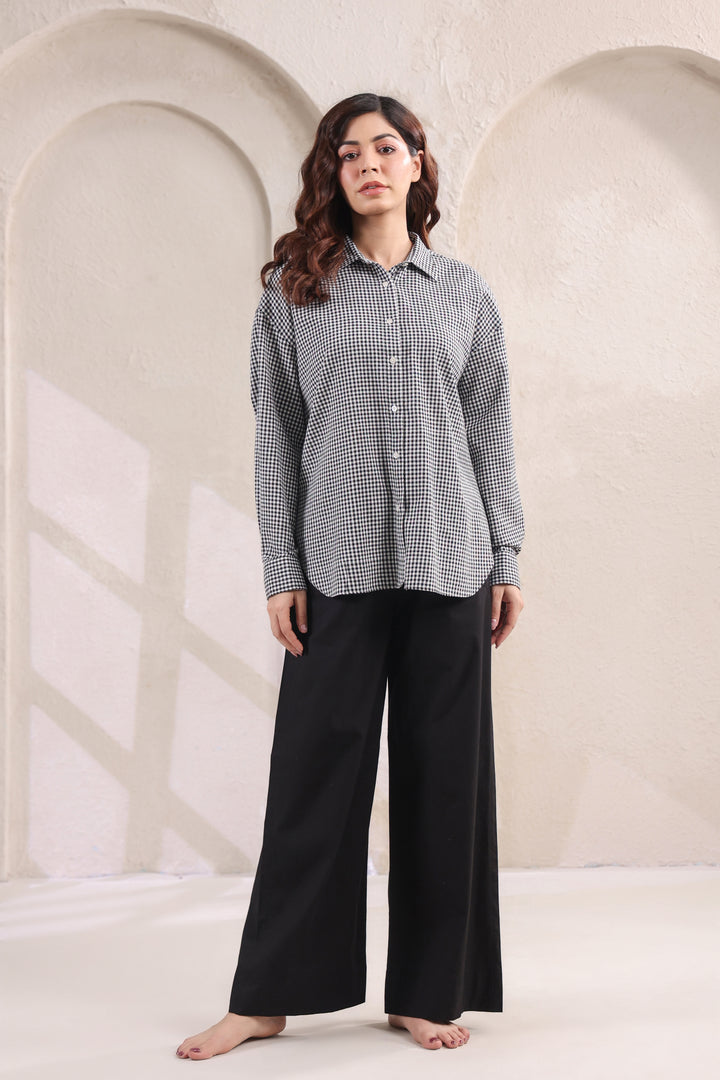 Step into effortless style with this relaxed fit cotton shirt, designed in subtle small checks for a timeless appeal. The lightweight fabric ensures all-day comfort, while the easy silhouette makes it a versatile wardrobe staple. Paired with classic black pants, this set strikes the perfect balance between laid-back ease and refined charm. Ideal for work, casual outings, or travel—this combination is a go-to choice for understated sophistication.