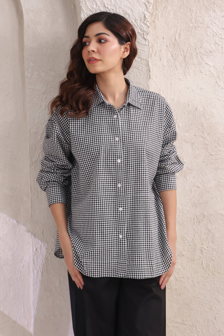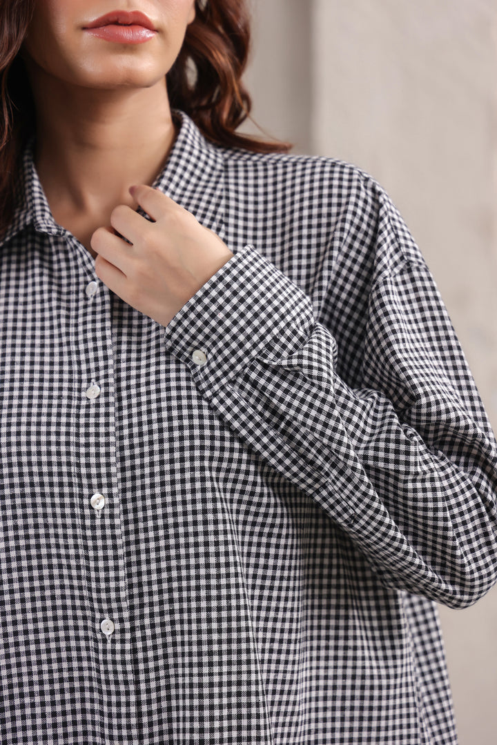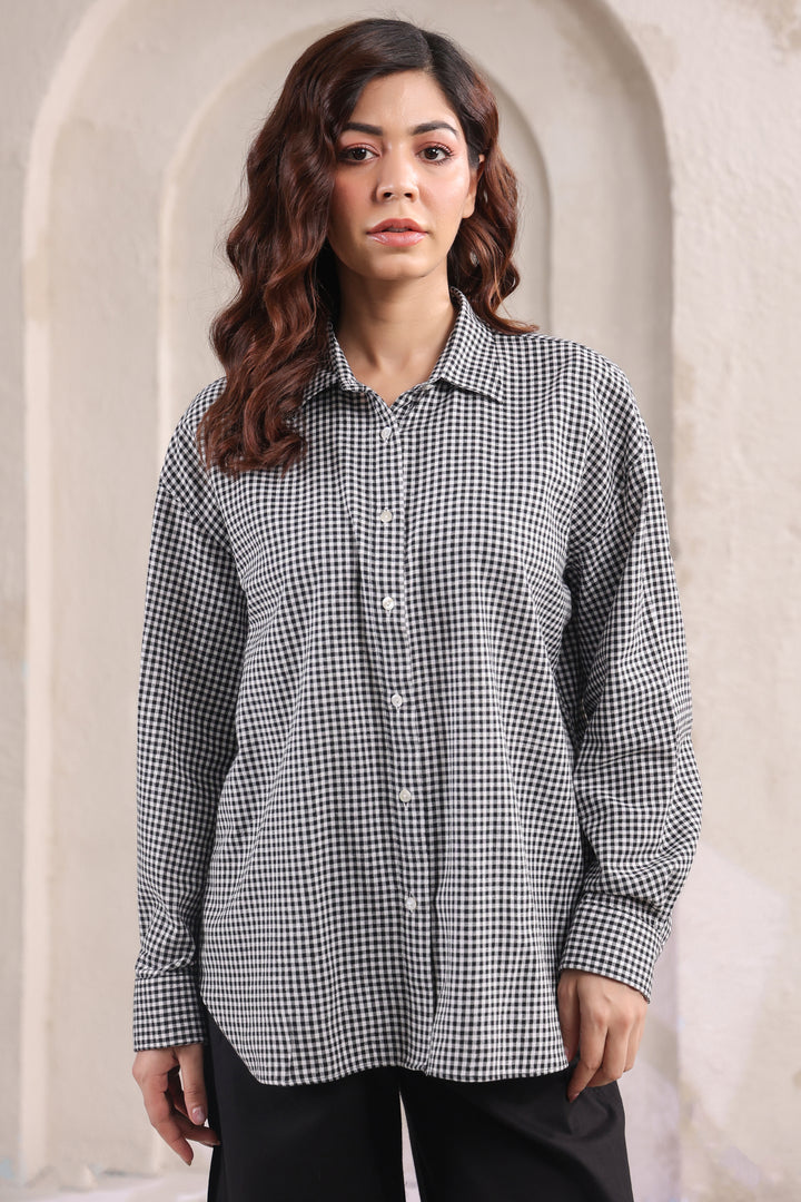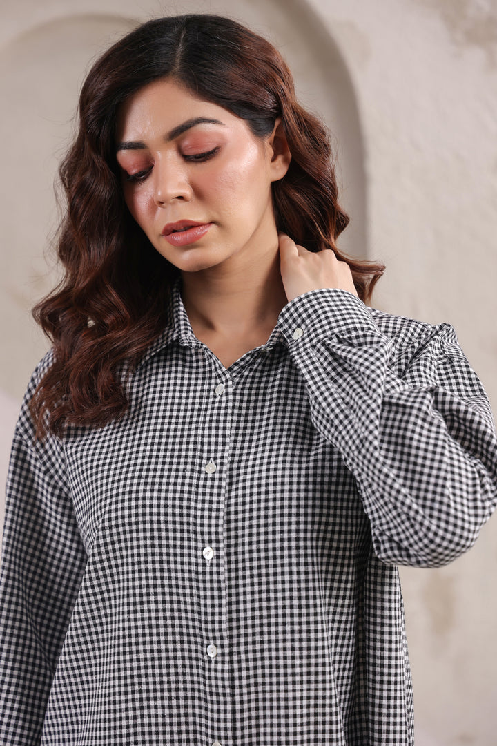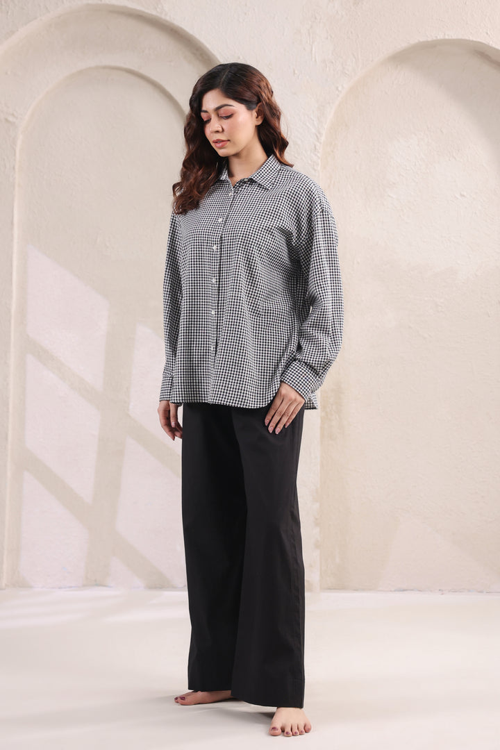 Step into effortless style with this relaxed fit cotton shirt, designed in subtle small checks for a timeless appeal. The lightweight fabric ensures all-day comfort, while the easy silhouette makes it a versatile wardrobe staple. Paired with classic black pants, this set strikes the perfect balance between laid-back ease and refined charm. Ideal for work, casual outings, or travel—this combination is a go-to choice for understated sophistication.