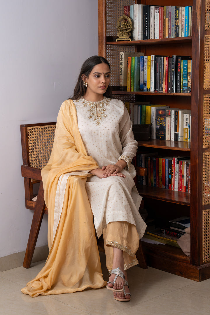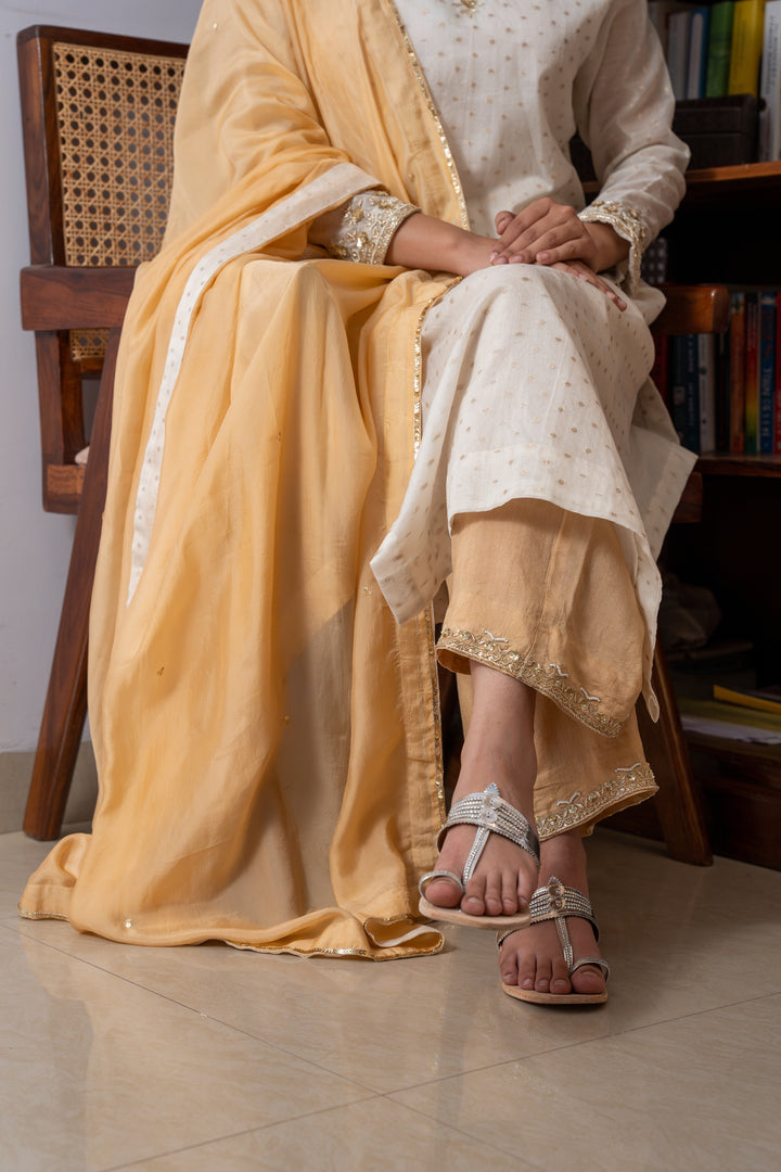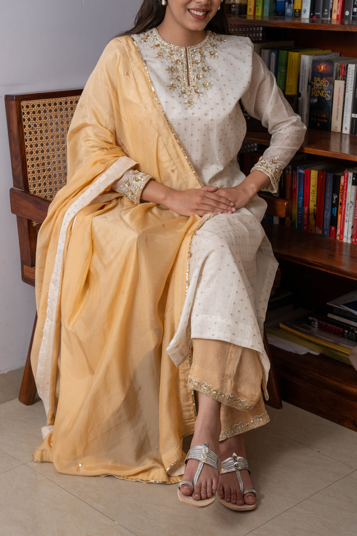 This chanderi brocade kurta includes a intricate zardosi and sequence hand embroidery on both sides of neck and on the sleeves paired with dola silk bottom which has a same work matches with the kurta and summer silk dupatta at its best. This ivory set of kurta, bottom and dupatta is all what dreams are made off.