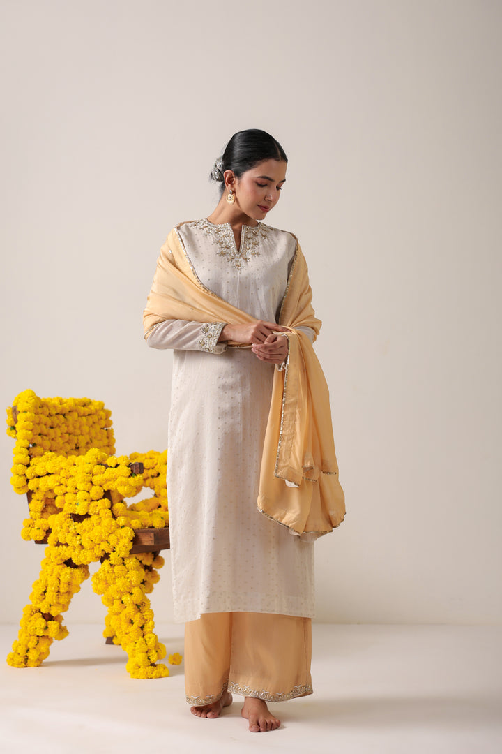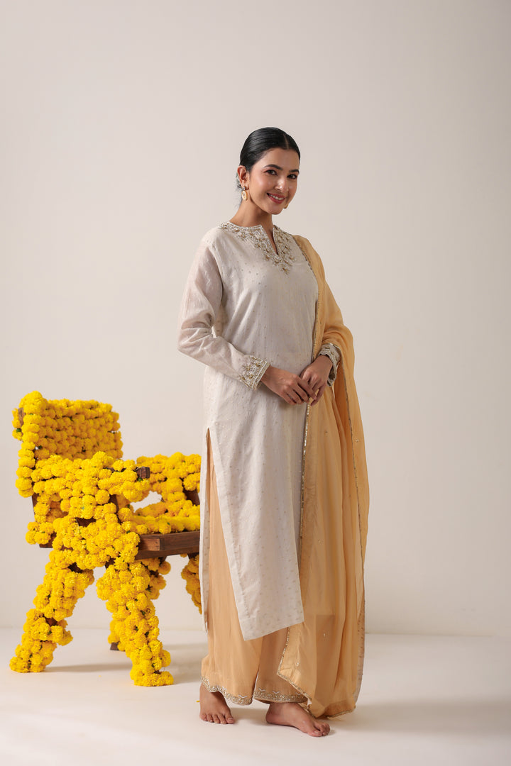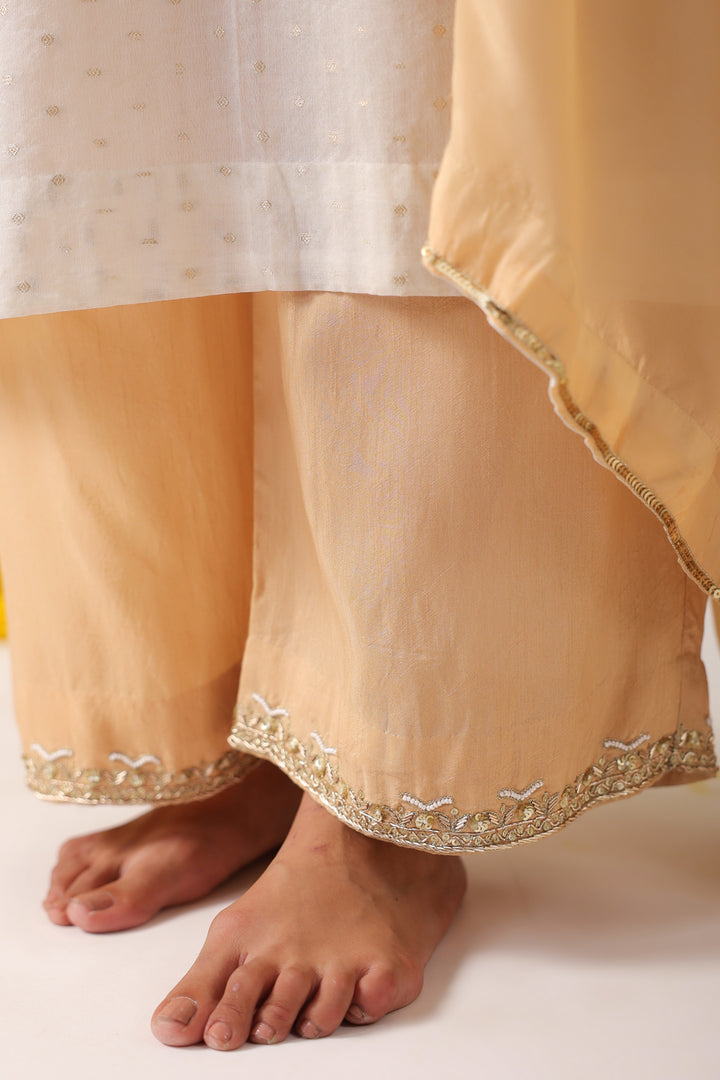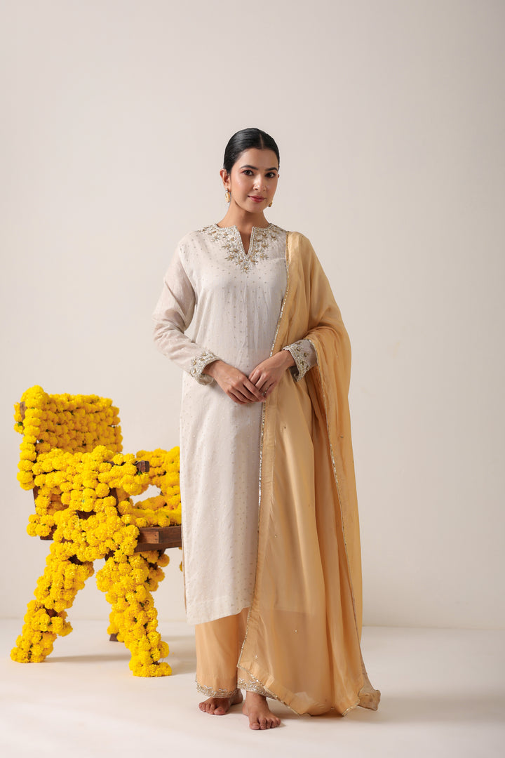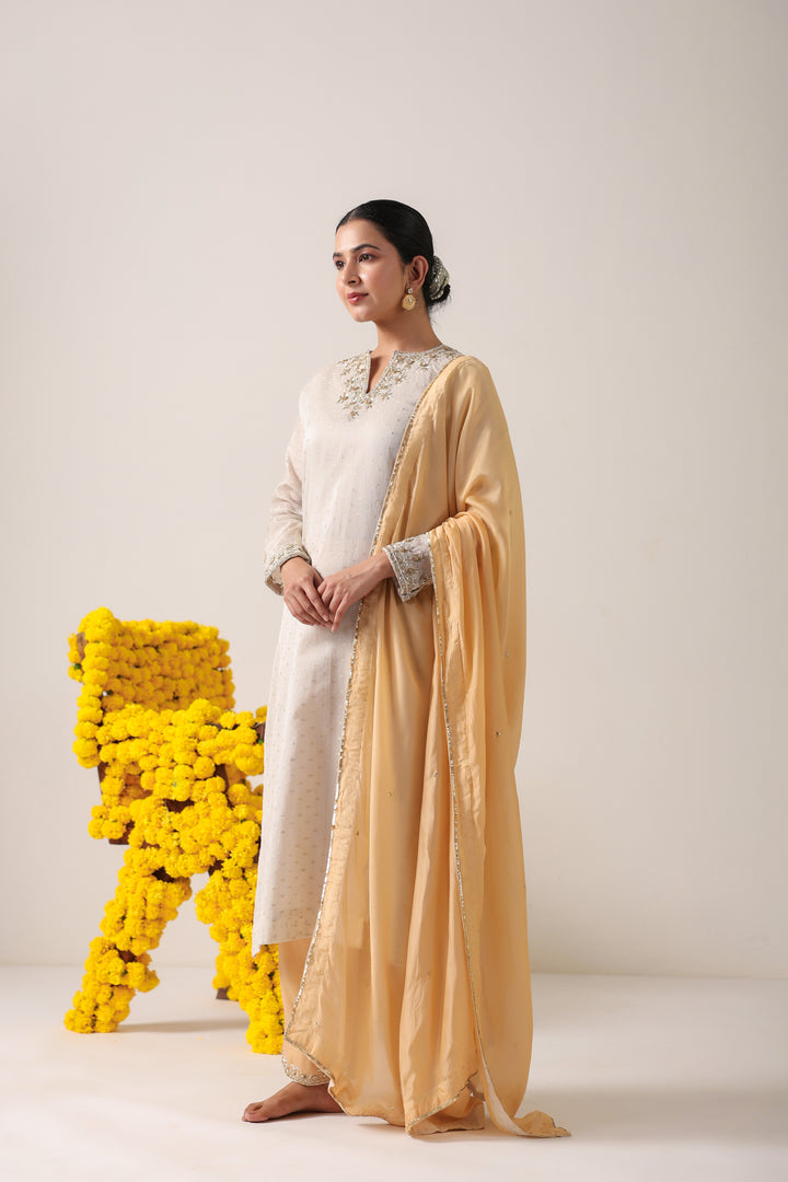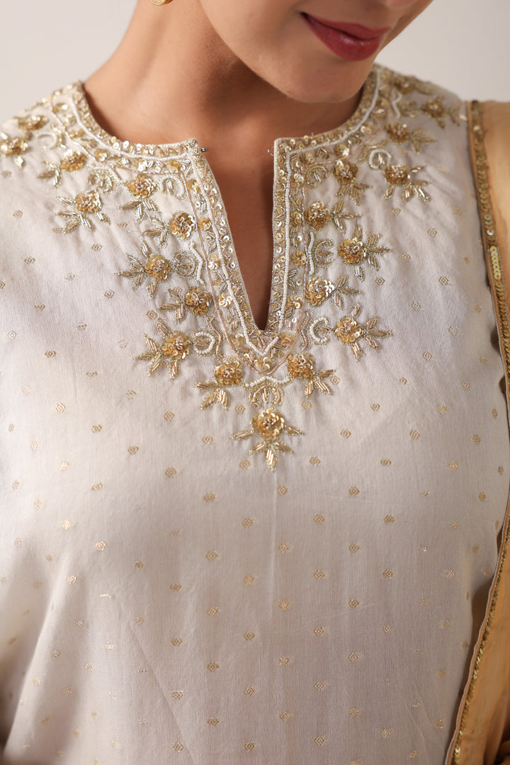 This chanderi brocade kurta includes a intricate zardosi and sequence hand embroidery on both sides of neck and on the sleeves paired with dola silk bottom which has a same work matches with the kurta and summer silk dupatta at its best. This ivory set of kurta, bottom and dupatta is all what dreams are made off.