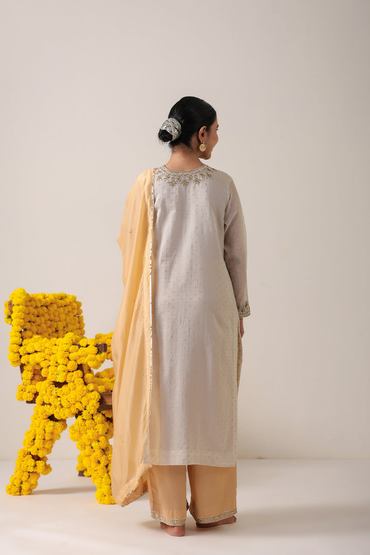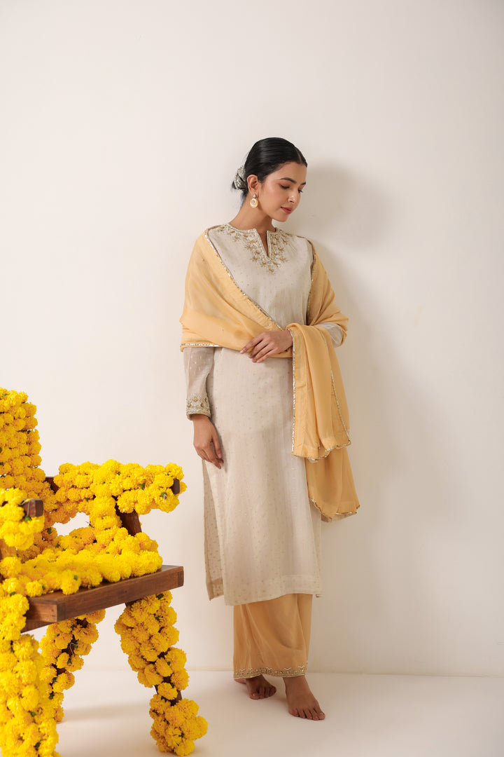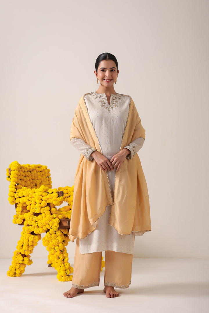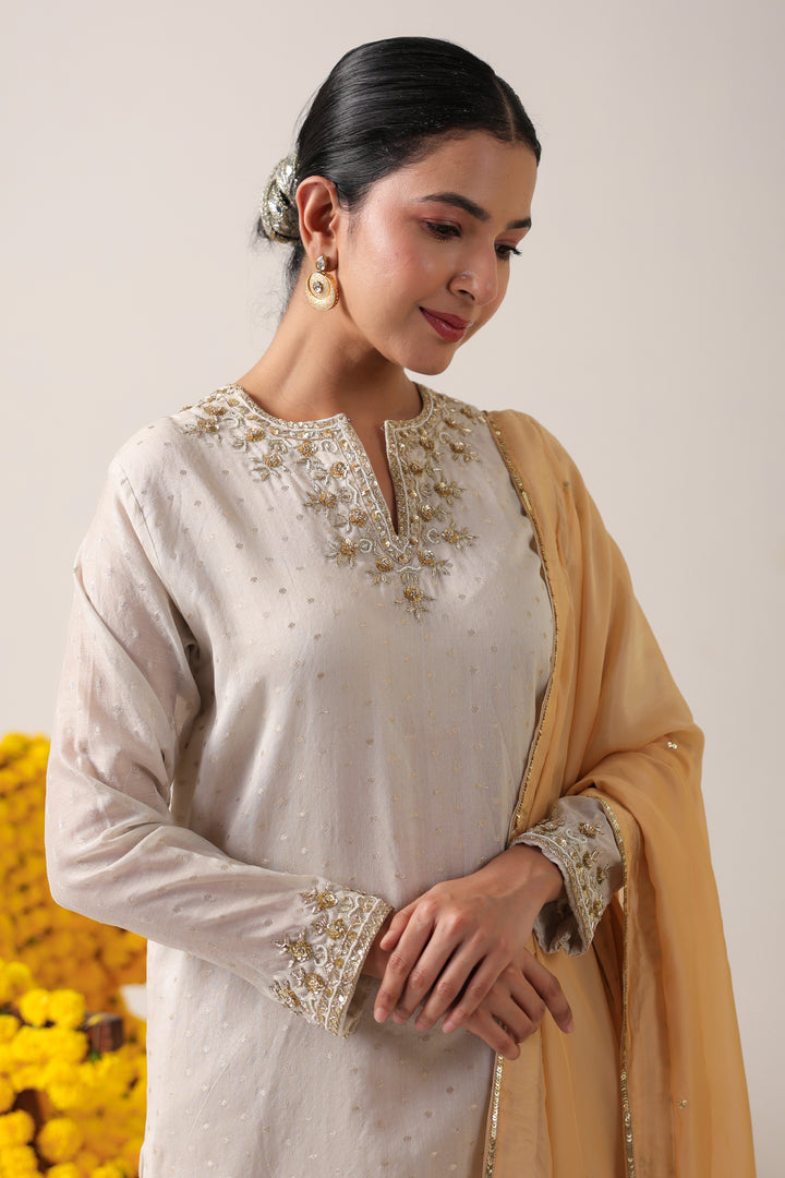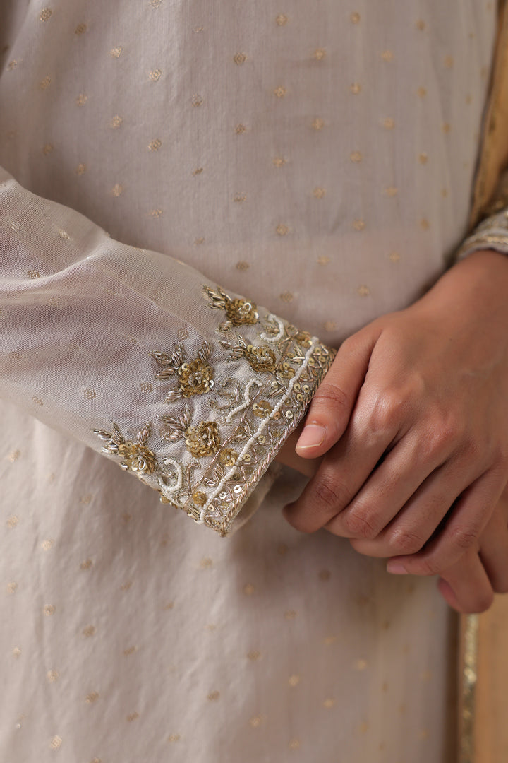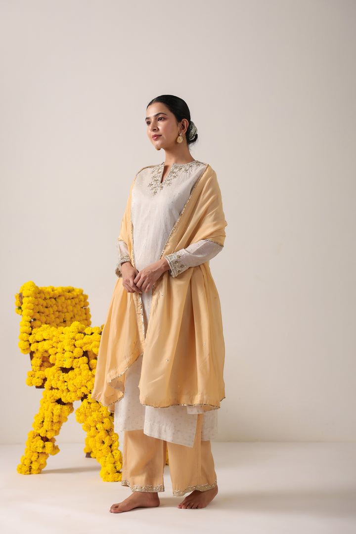 This chanderi brocade kurta includes a intricate zardosi and sequence hand embroidery on both sides of neck and on the sleeves paired with dola silk bottom which has a same work matches with the kurta and summer silk dupatta at its best. This ivory set of kurta, bottom and dupatta is all what dreams are made off.