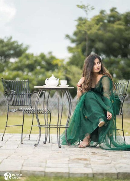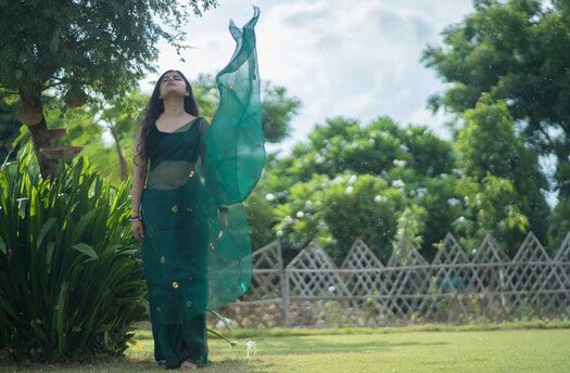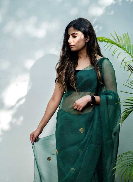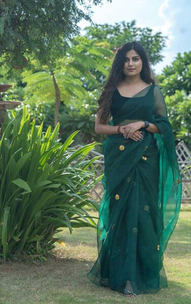 Panna Green Saree made in pure organza. Highlighted with gota phool. This saree comes with a matching blouse in pure crepe.