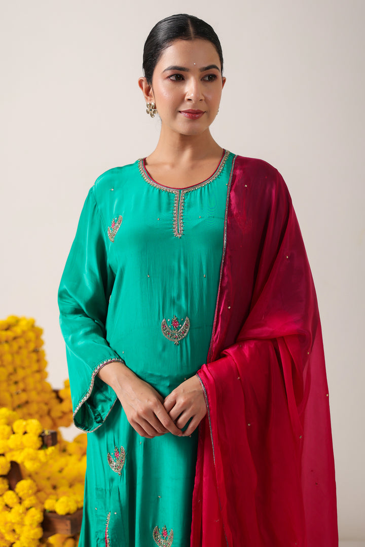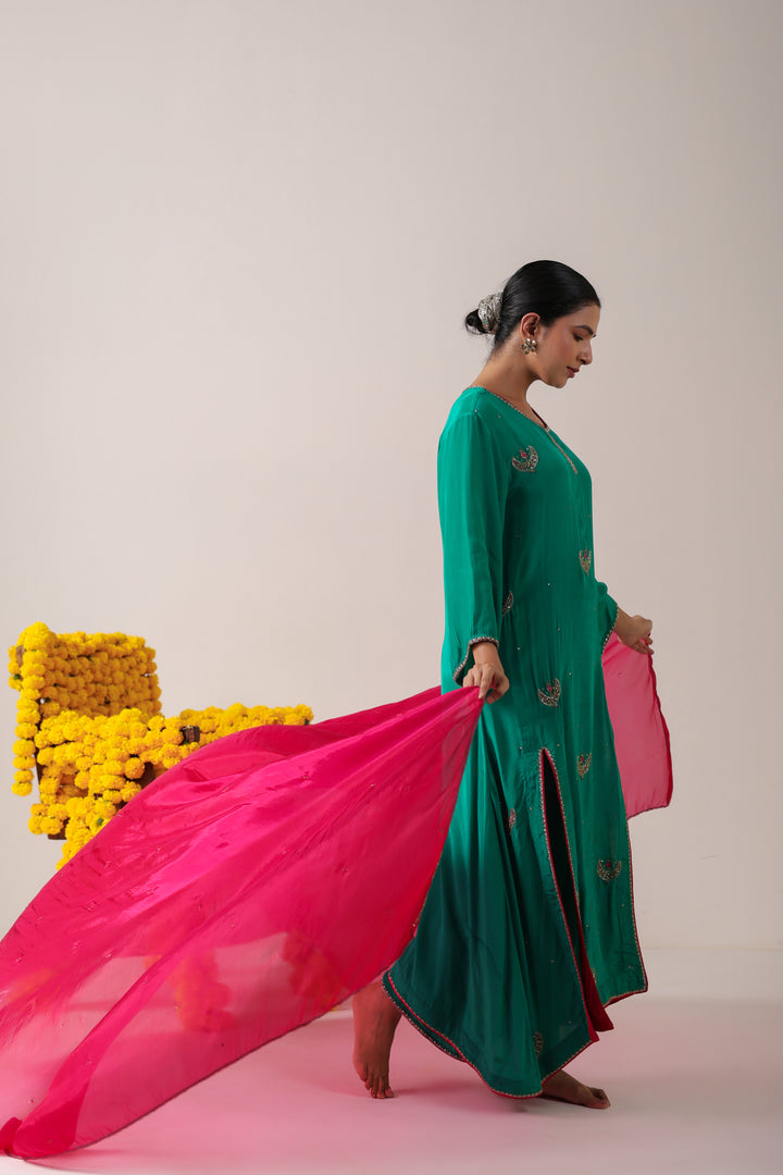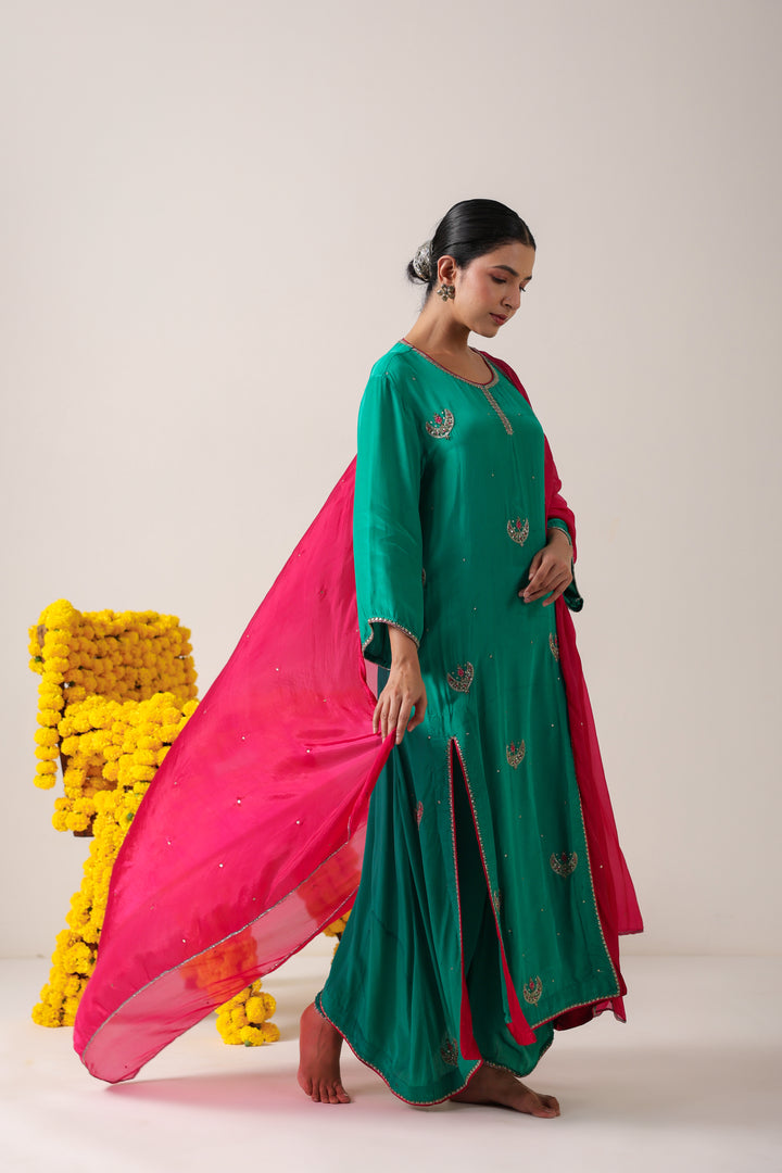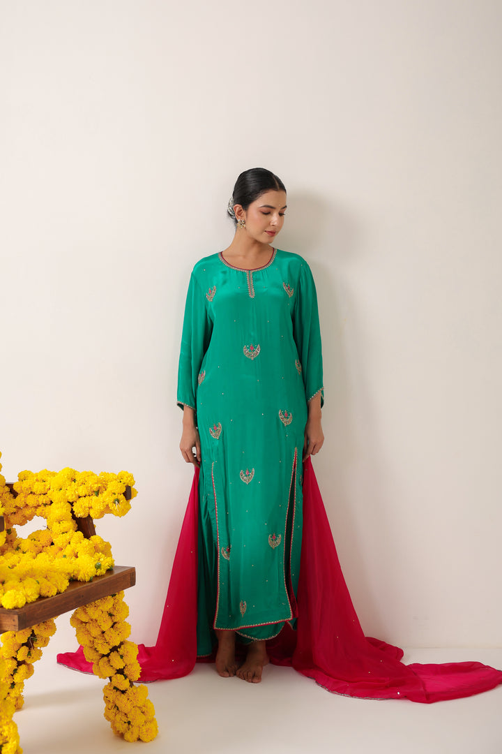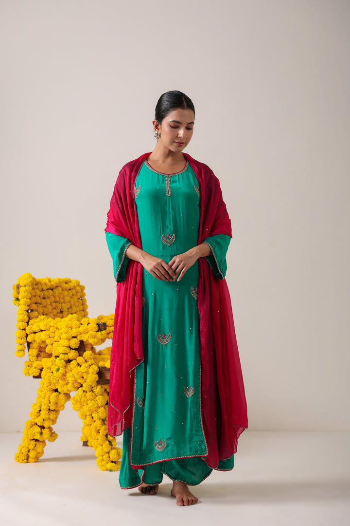 This pure natural crepe suit set is enough to grab all the attention at that cocktail party. This set includes kurta, bottom and dupatta. The kurta and bottom are made in natural crepe and dupatta is made in summer silk. This set has beautiful work which is perfect for any occasion.