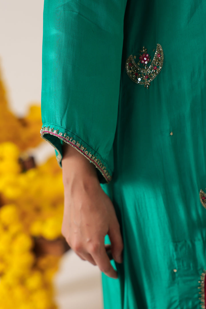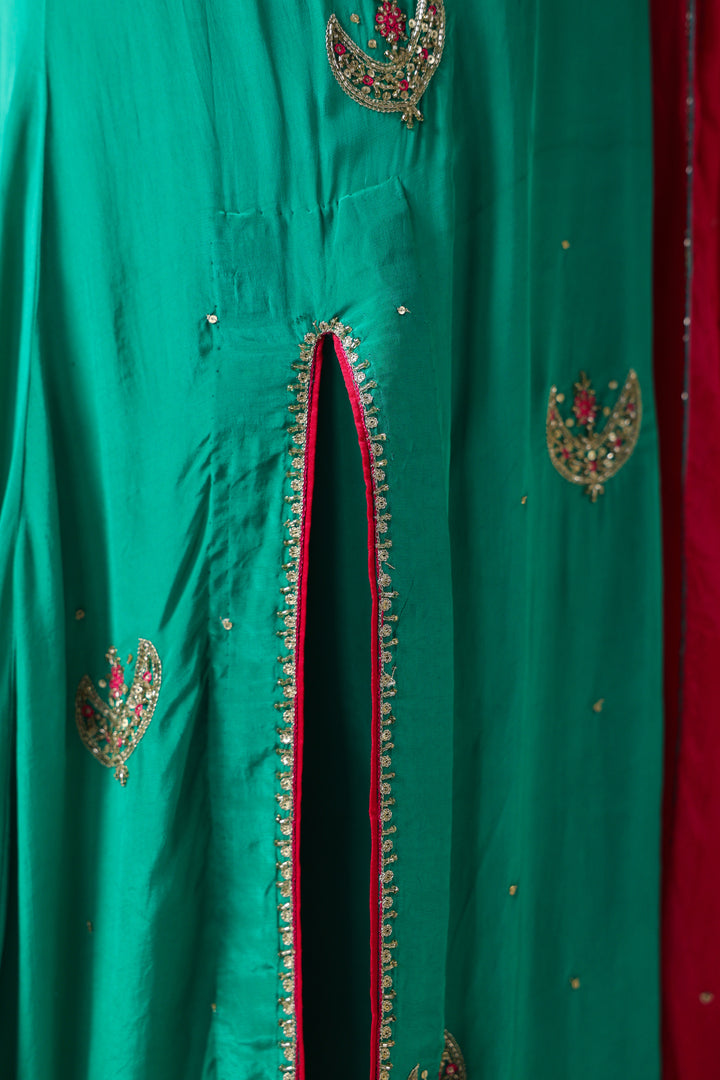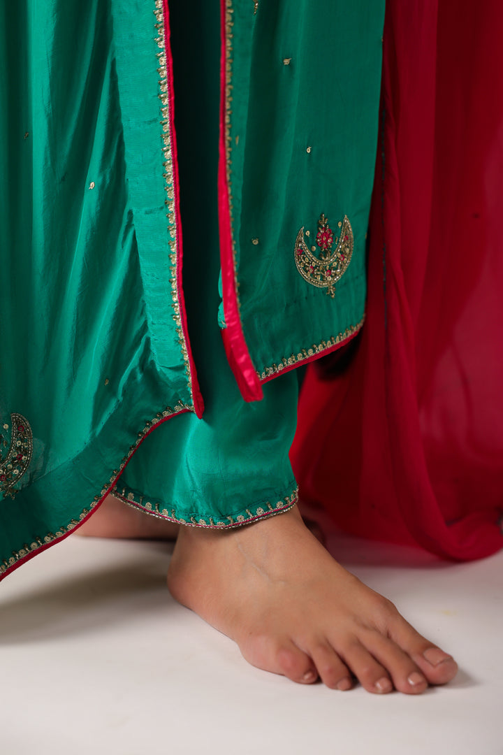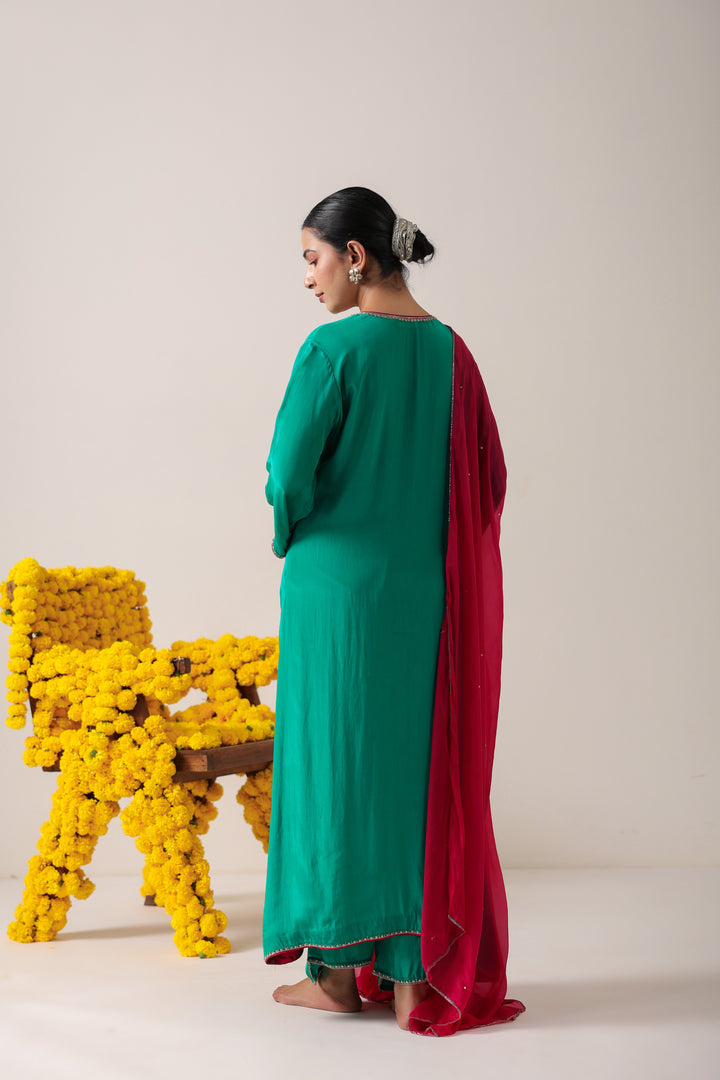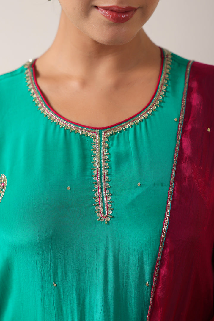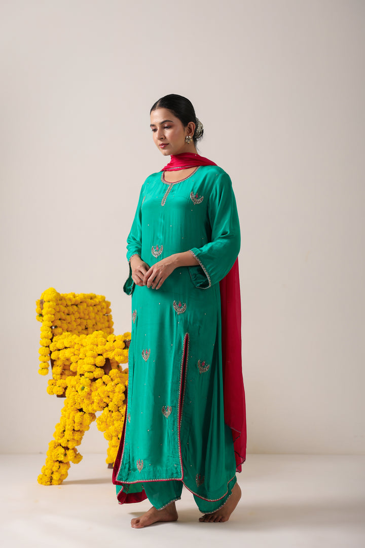 This pure natural crepe suit set is enough to grab all the attention at that cocktail party. This set includes kurta, bottom and dupatta. The kurta and bottom are made in natural crepe and dupatta is made in summer silk. This set has beautiful work which is perfect for any occasion.