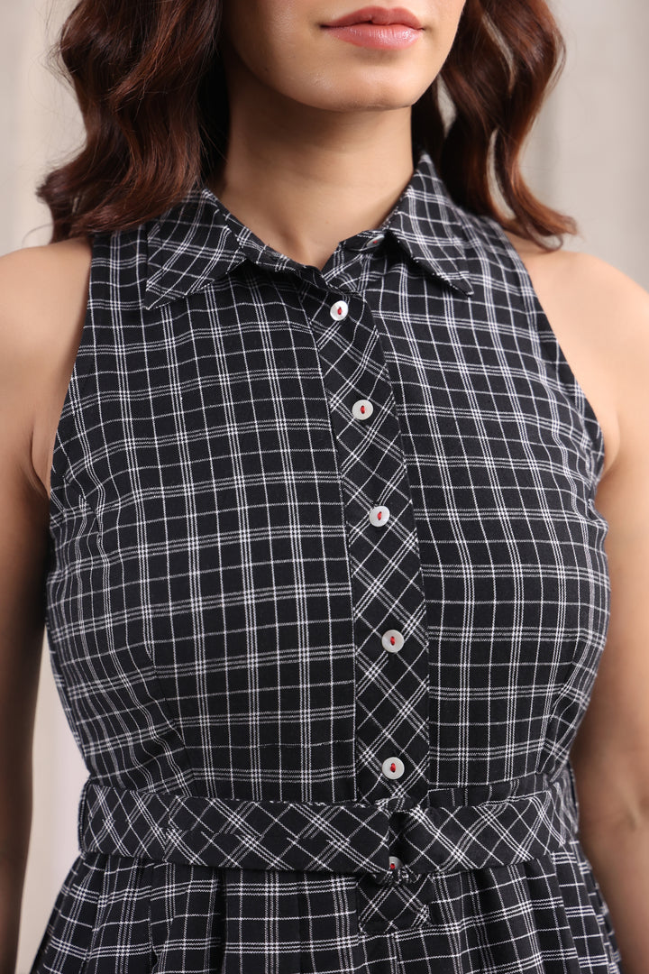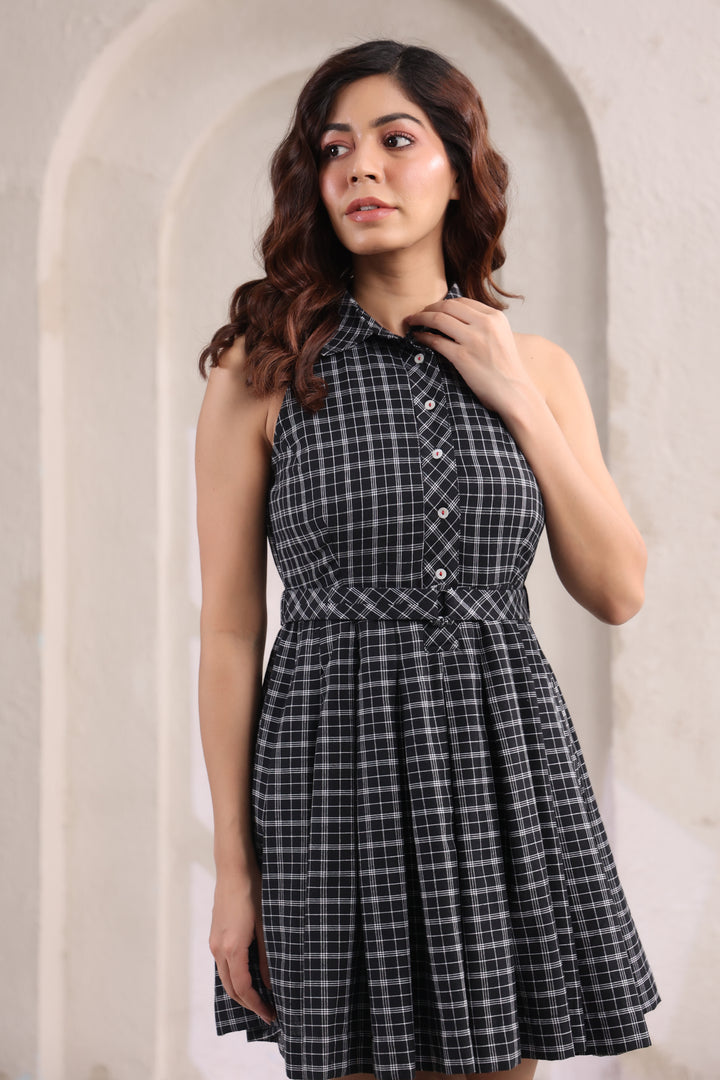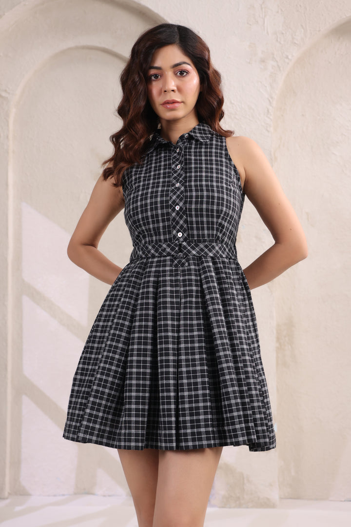 Chic and playful, this black short dress is designed in classic checks with a flattering fit-and-flare silhouette. The fitted bodice accentuates your shape, while the flared hem adds a touch of movement and charm. Crafted for comfort and style, it’s the perfect choice for brunch dates, evenings out, or any moment you want to look effortlessly put-together.