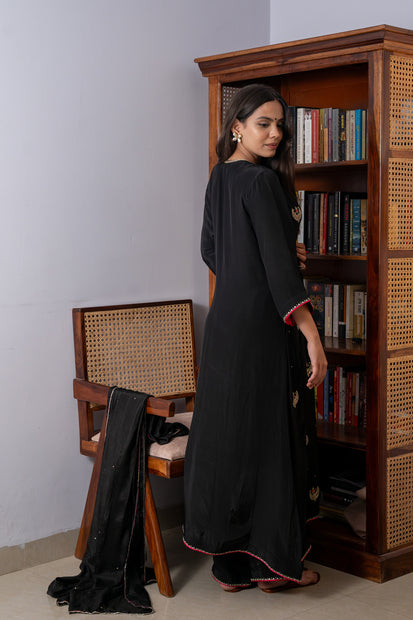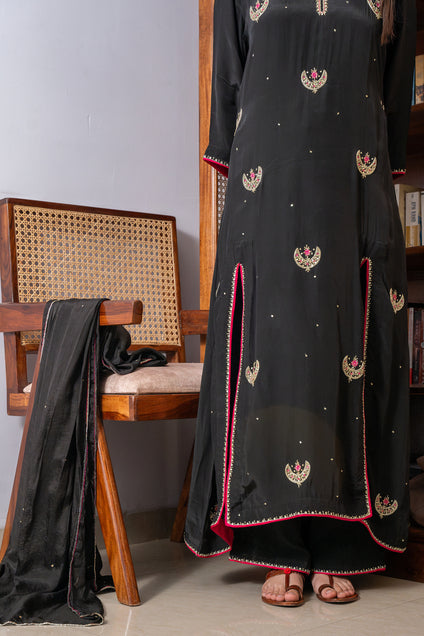 This pure natural crepe suit set is enough to grab all the attention at that cocktail party. This set includes kurta, bottom and dupatta. The kurta and bottom are made in natural crepe and dupatta is made in summer silk. This set has beautiful work which is perfect for any occasion.