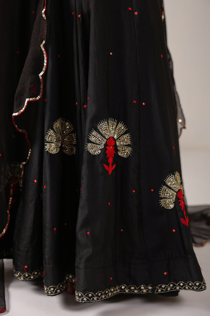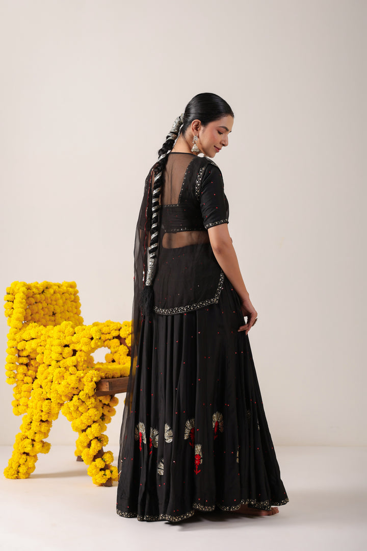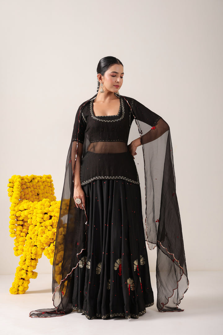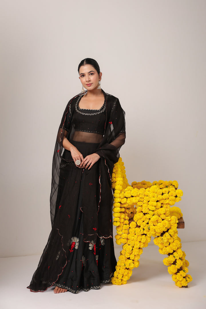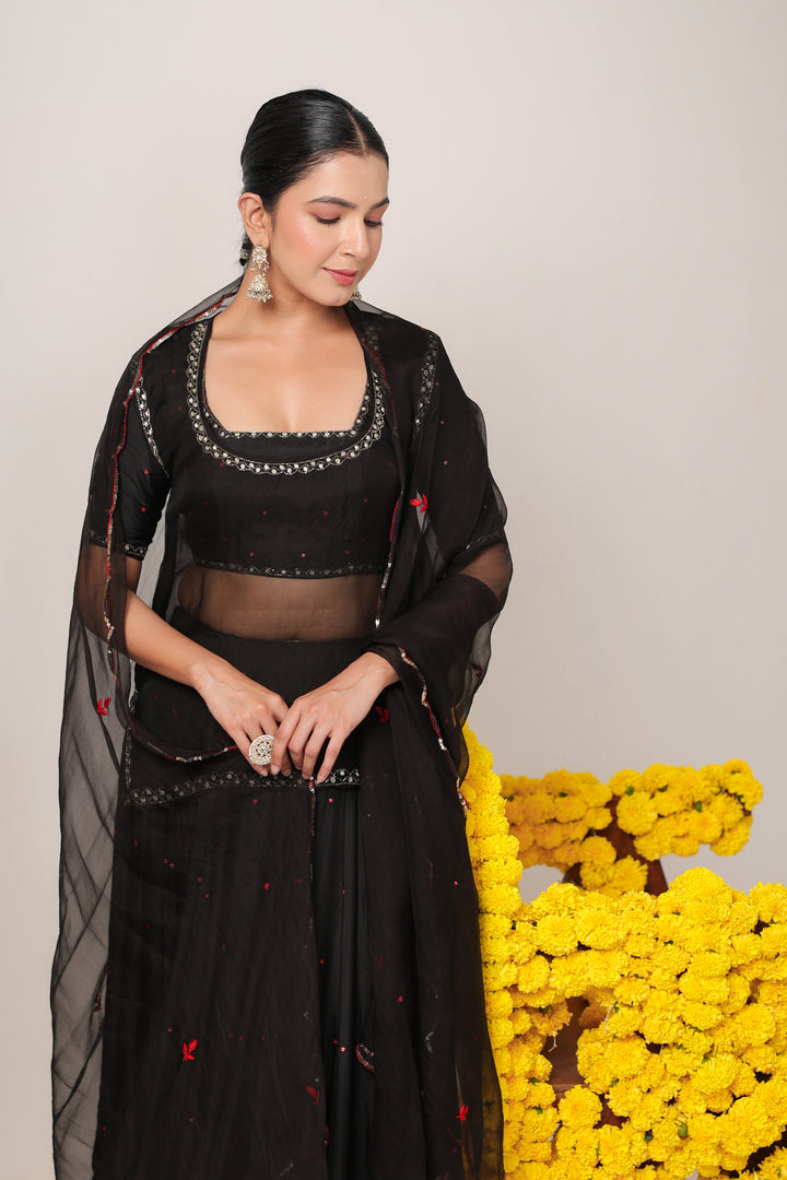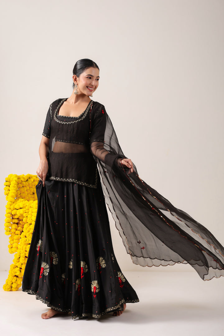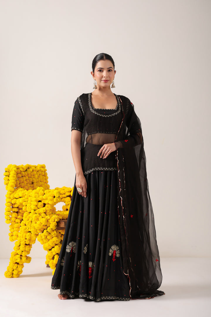 The set comes with Lehenga, Blouse, Kurti and Dupatta. Lehenga and Blouse are made in pure silk. Dupatta and Kurti are made in pure organza.