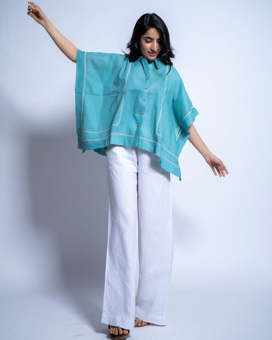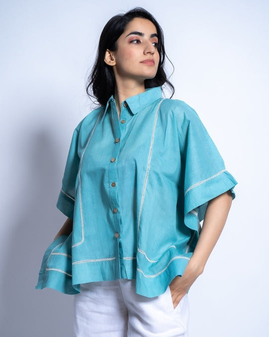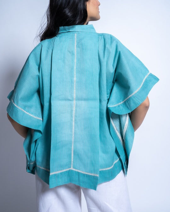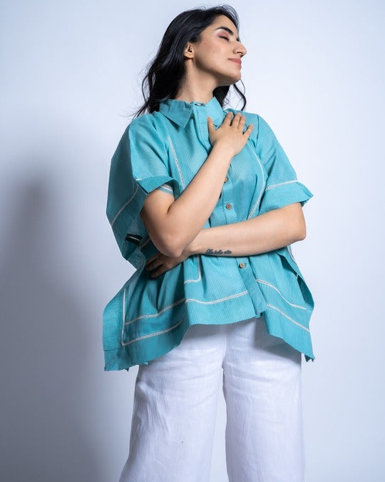 A breezy blouse in pure cotton. Oversized. Drop shoulders with a stepped hemline. It is an lacy affair.