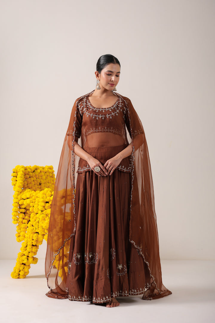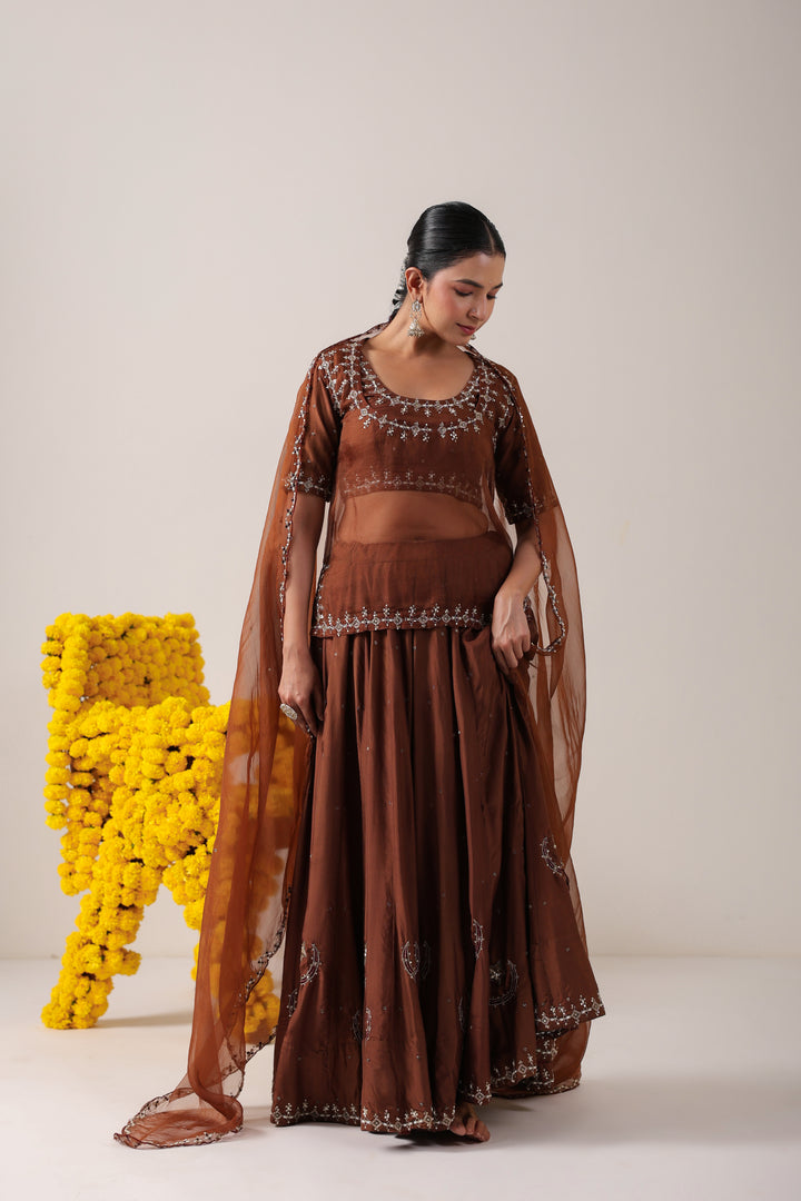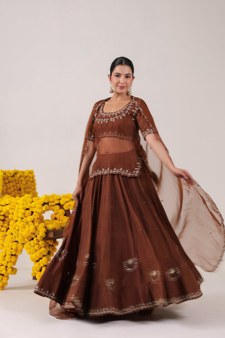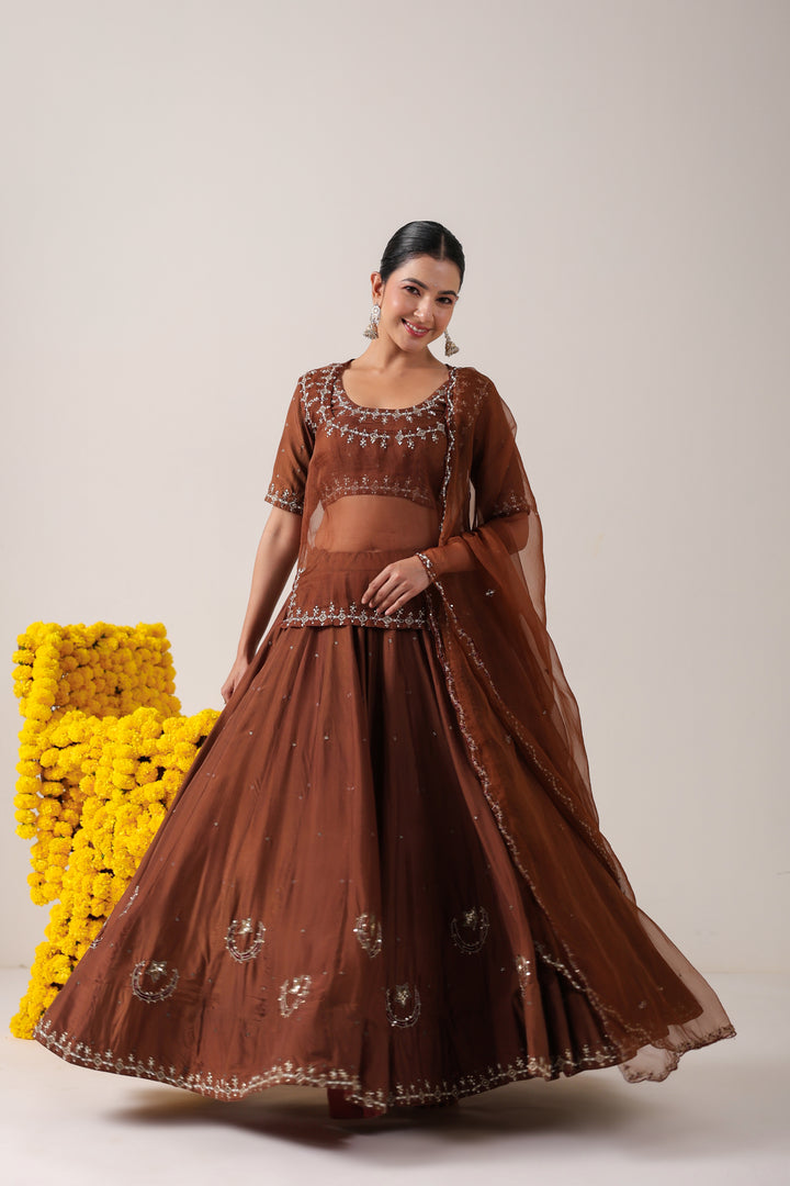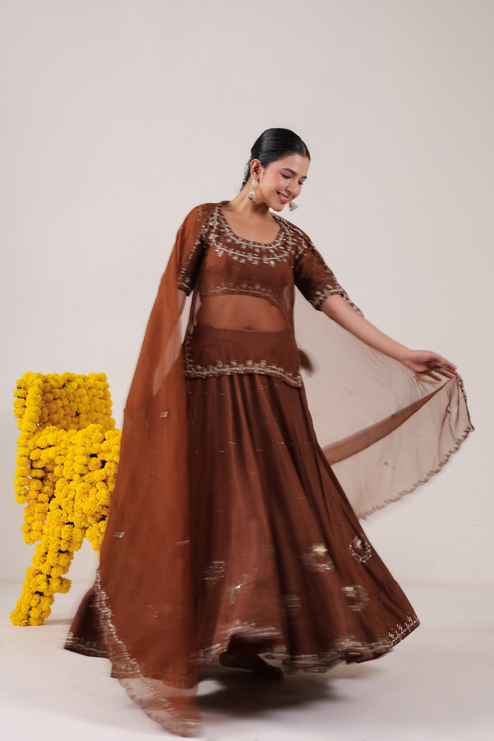 The set comes with Lehenga, Blouse, Kurti and Dupatta. Lehenga and Blouse are made in pure silk. Dupatta and Kurti are made in pure organza.