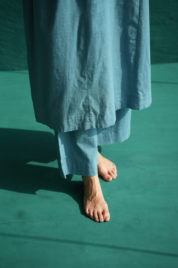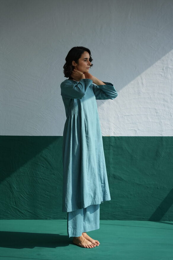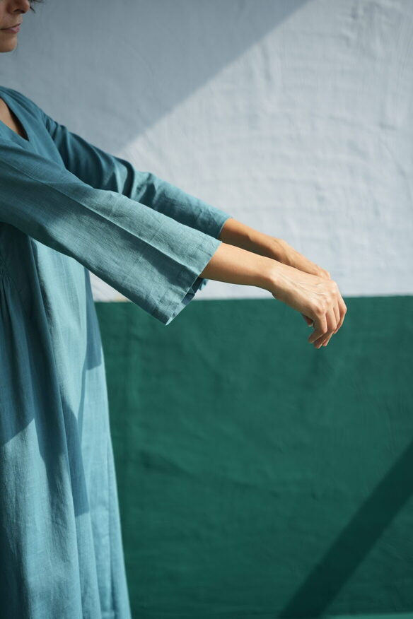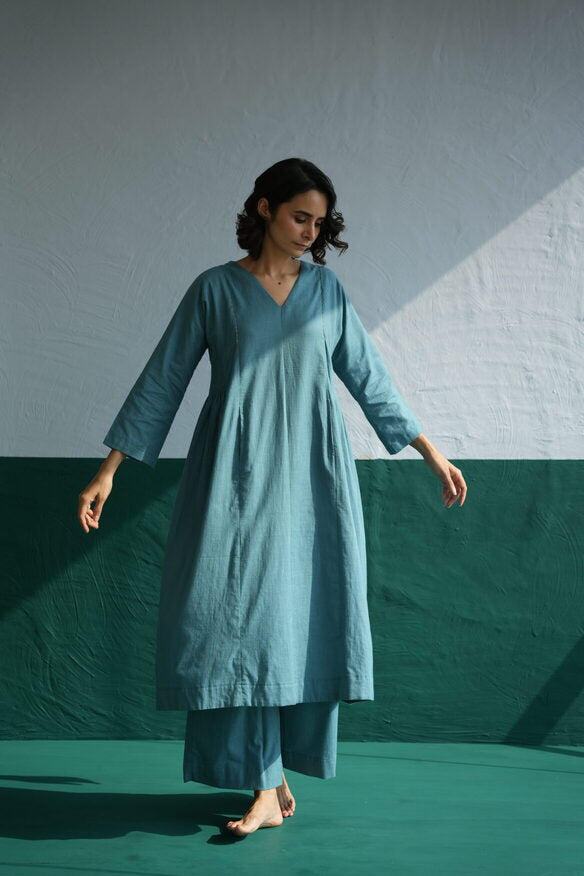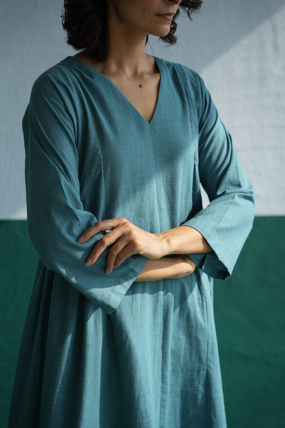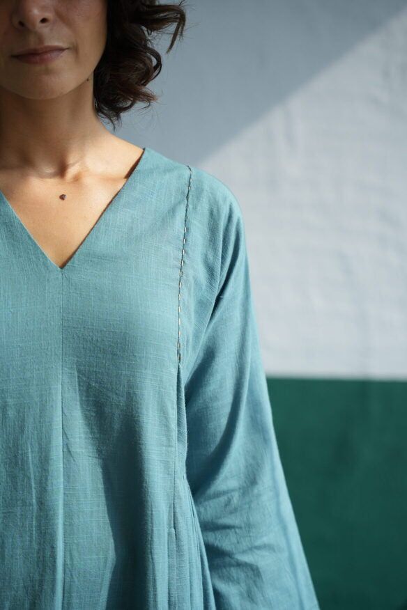 In an earthy teal blue, the Pintuck Kurta Designed for day long comfort. The V-neck style features hints of light thread detailing, adding a contrasting pop to the fit. Contemporary and consciously designed, the relaxed fit leaves you feeling bright and breezy all day.
