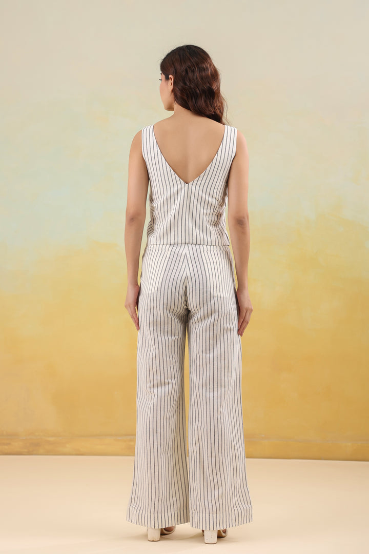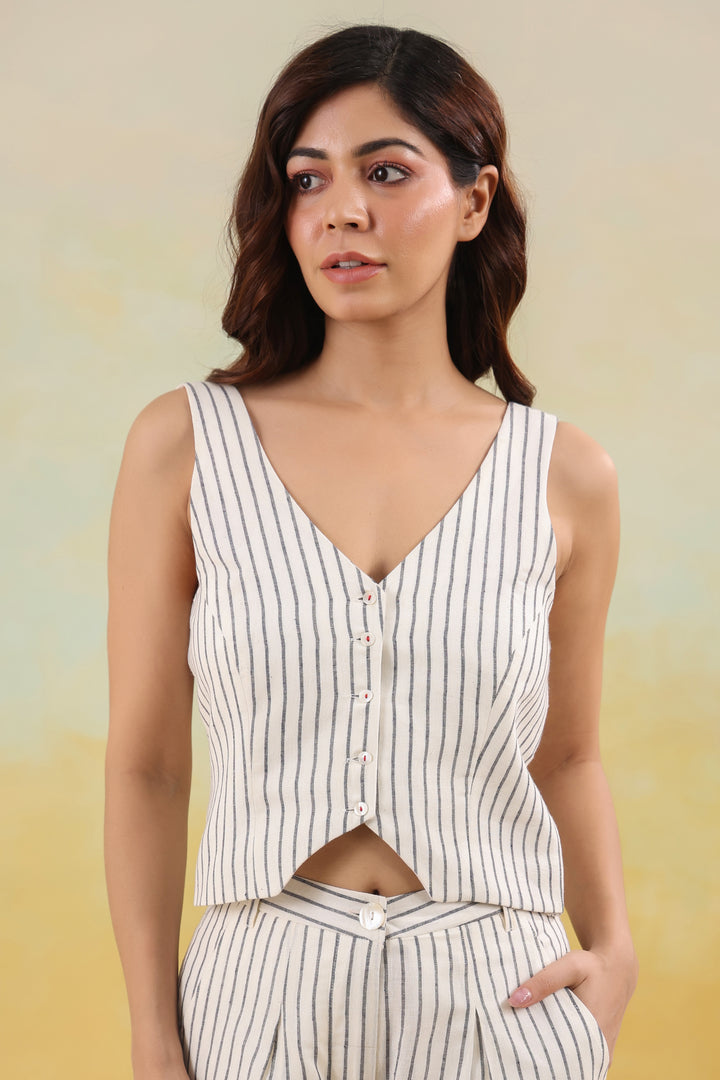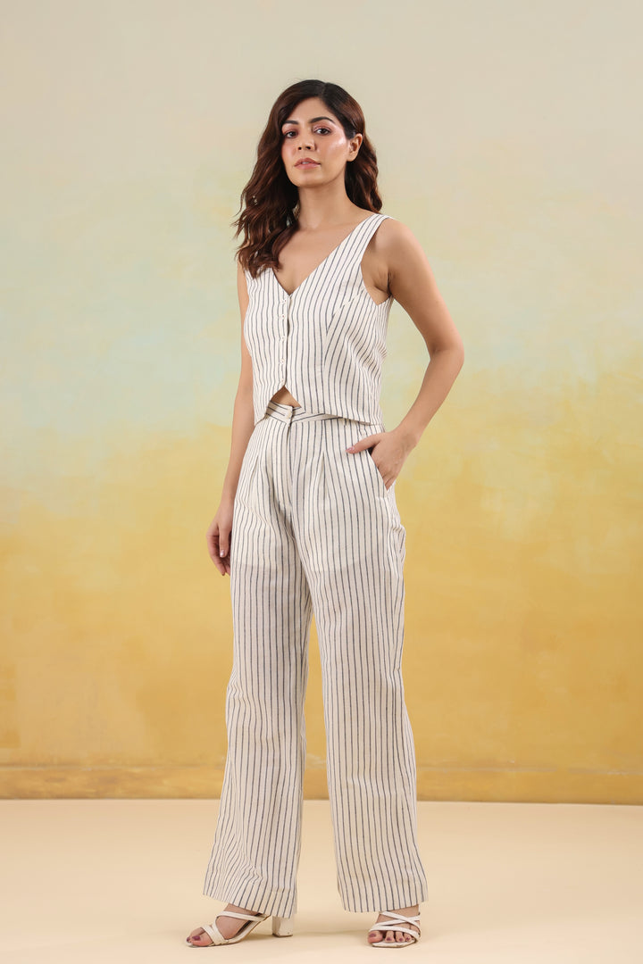Effortlessly chic, this co-ord set features a waist-style crop top paired with matching pants in white, accented by sleek grey stripes all over. The tailored crop top adds a modern edge, while the coordinated pants keep the look balanced and versatile. Perfect for brunches, casual outings, or evening get-togethers, this set blends comfort with contemporary style for a look that’s polished yet easygoing.