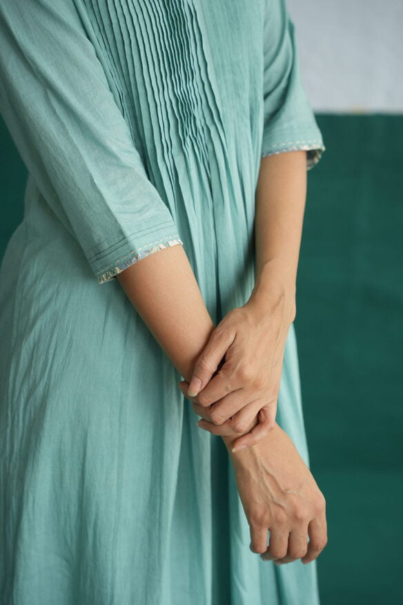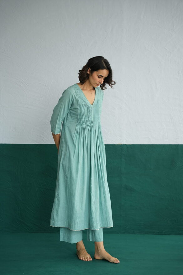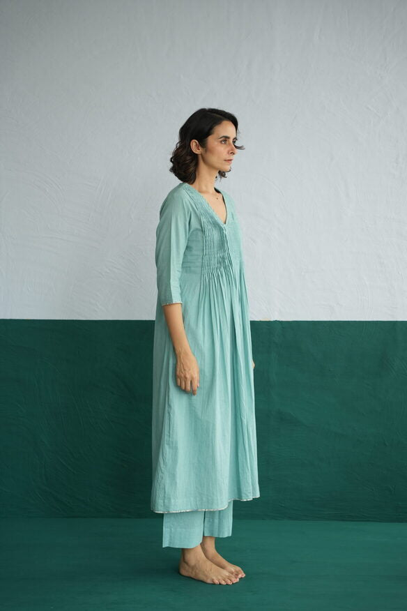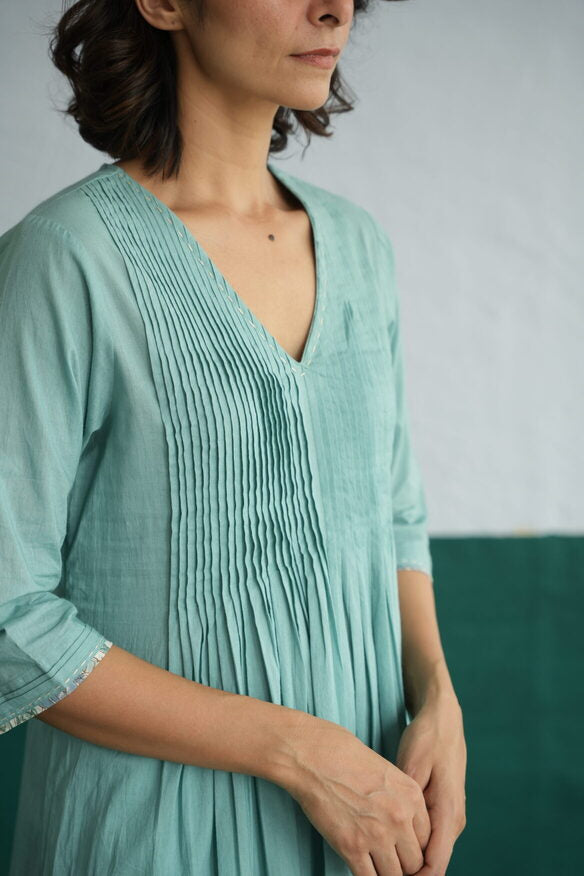 In a pastel sea green, the Pintuck Kurta Designed for day long comfort. The V-neck style features hints of light...