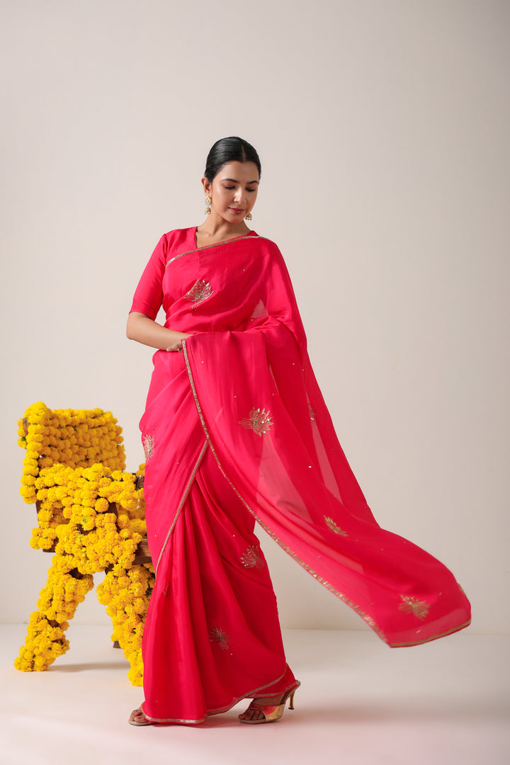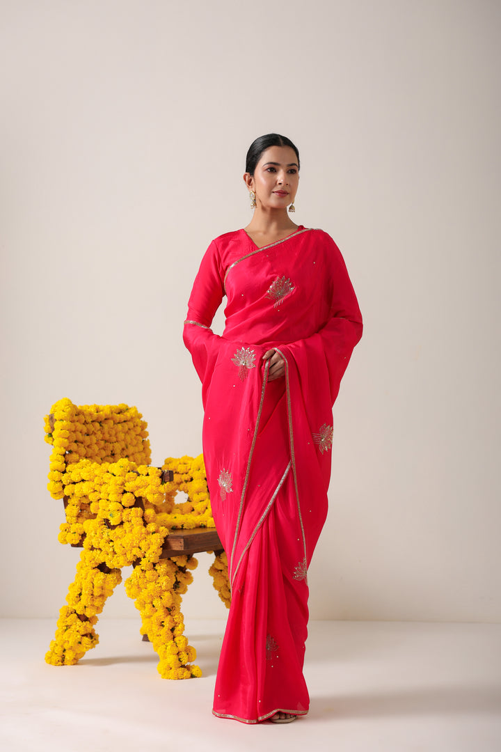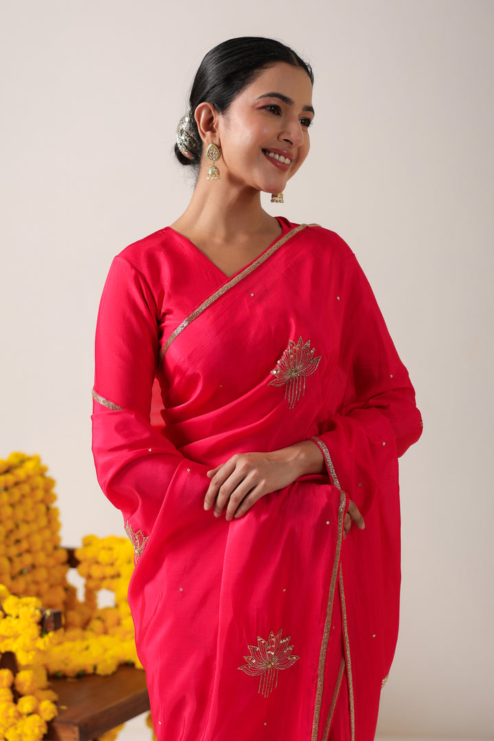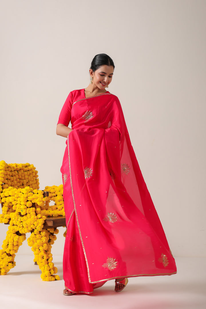 In pink silk, she begins her forever : Draped in sheer elegance, this beautiful pink saree crafted in pure Upada silk is a celebration of luxury and grace. Its soft, luminous texture is enriched with delicate handwork all over, adding just the right touch of shimmer and artistry to every fold. Lightweight yet opulent, the saree flows effortlessly, making it a perfect outfit for a newlywed bride—radiant, graceful, and timeless. The tender pink hue speaks of love and new beginnings, while the intricate craftsmanship ensures you shine with understated grandeur. NOTE : No BLOUSE
