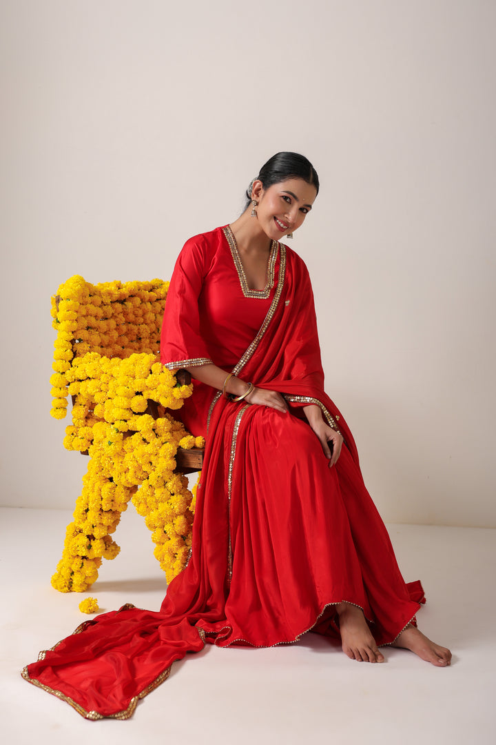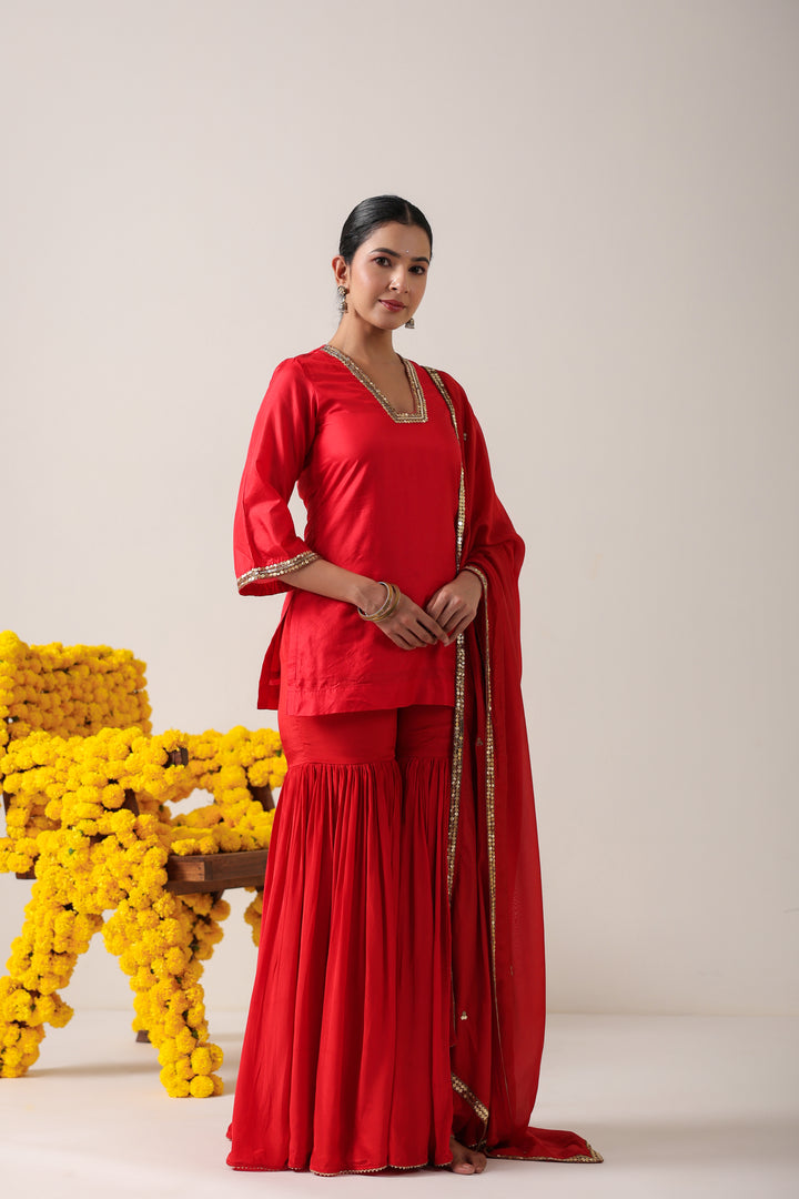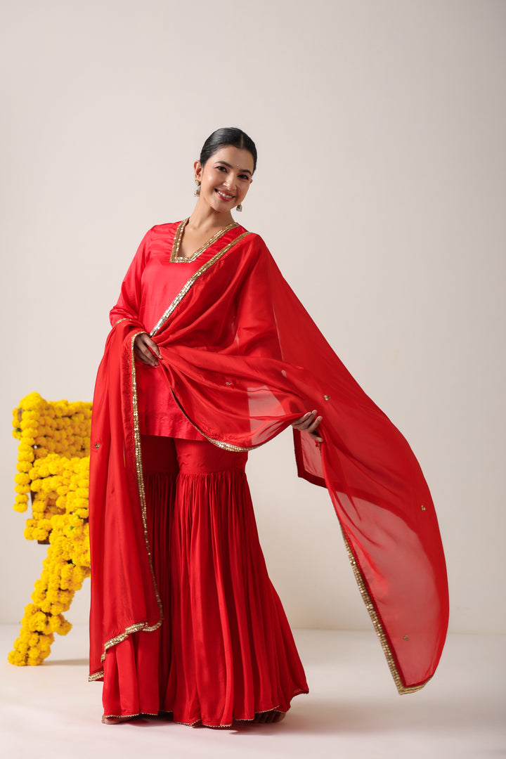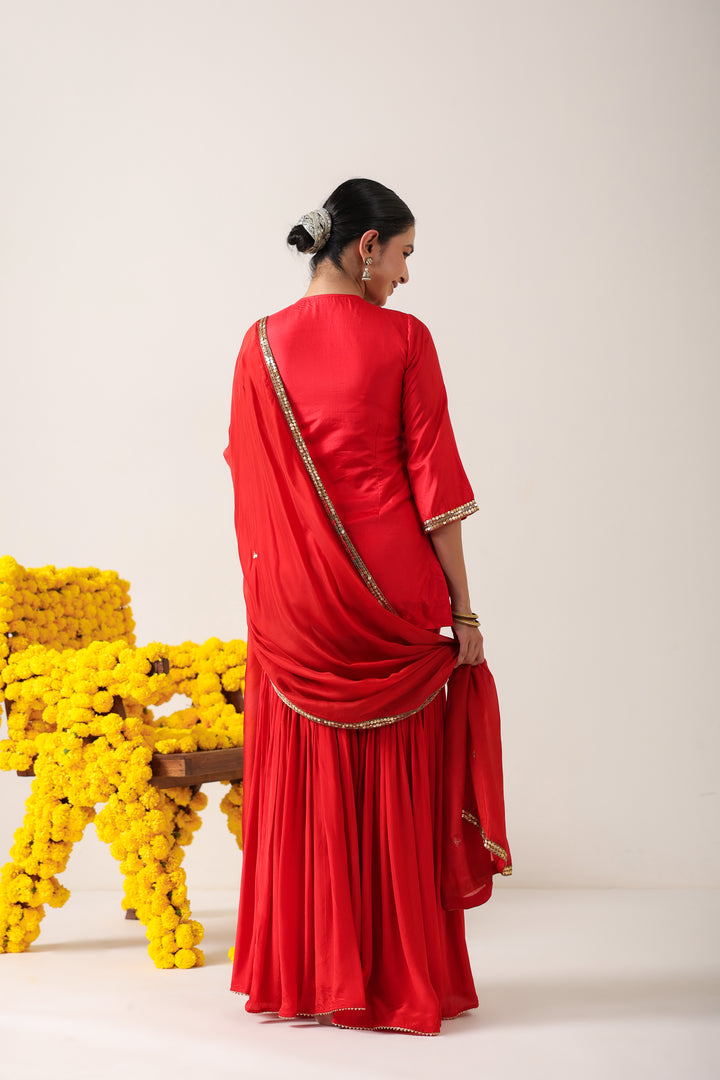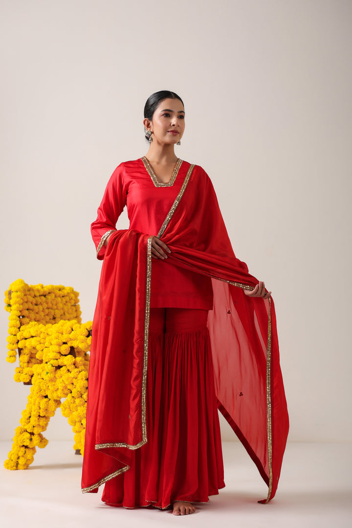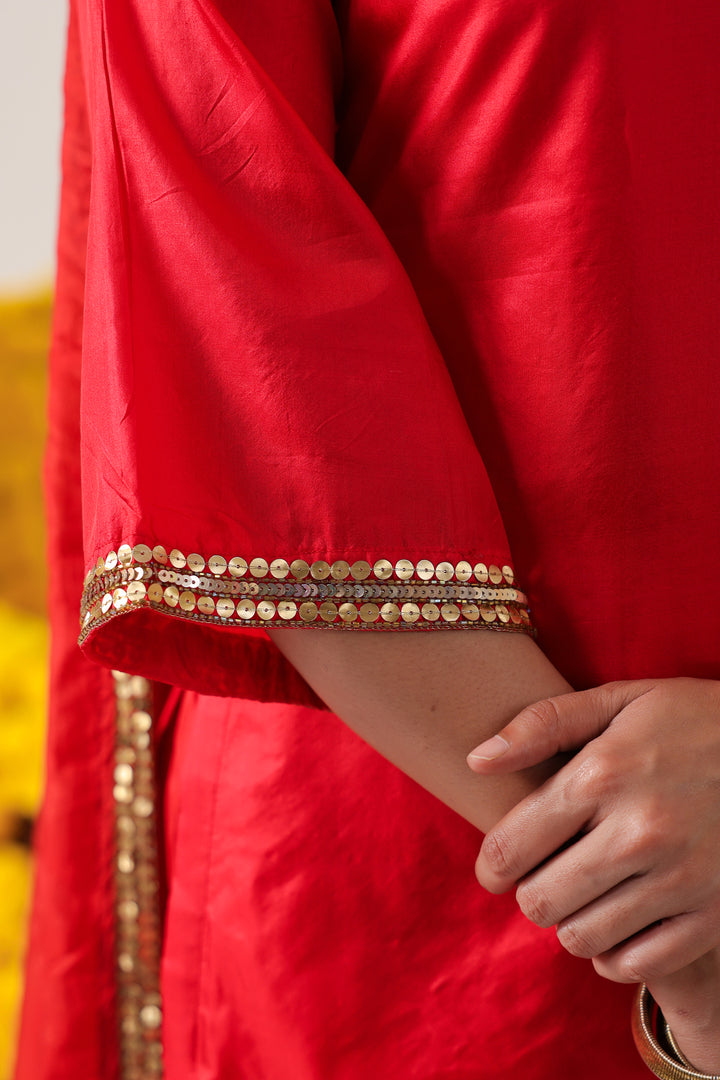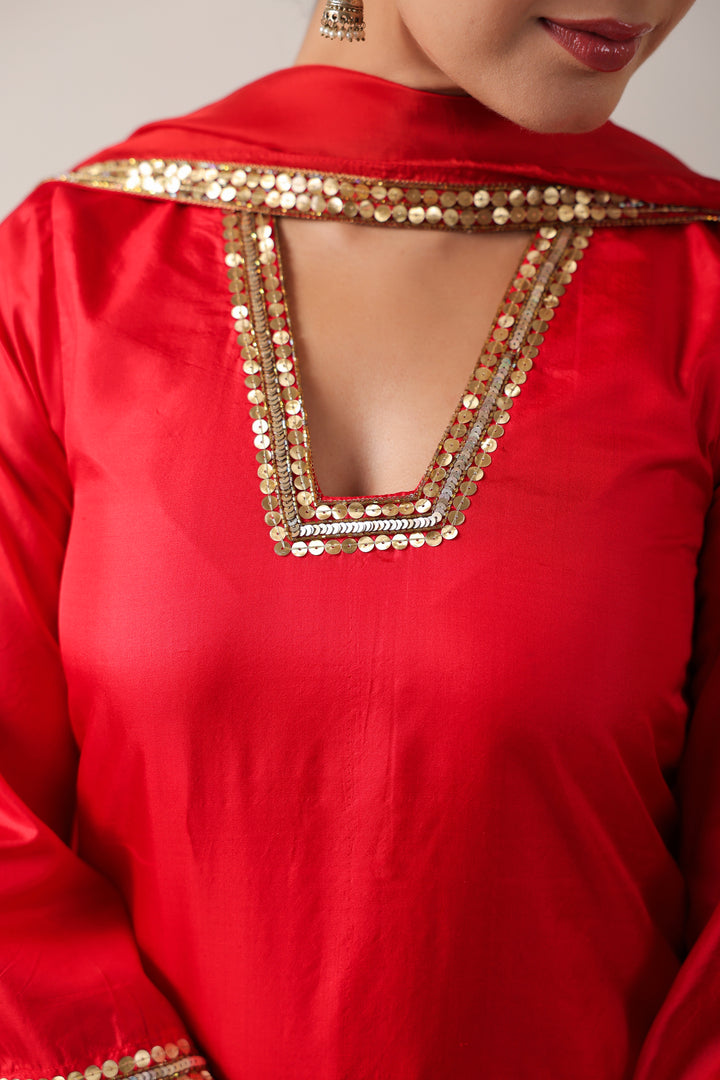 Soft silk kurta & dupatta with golden sitara work, all hand embroidered, this kurta is paired with a crepe salwar in red monotone .