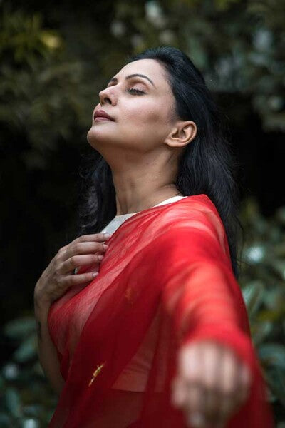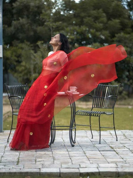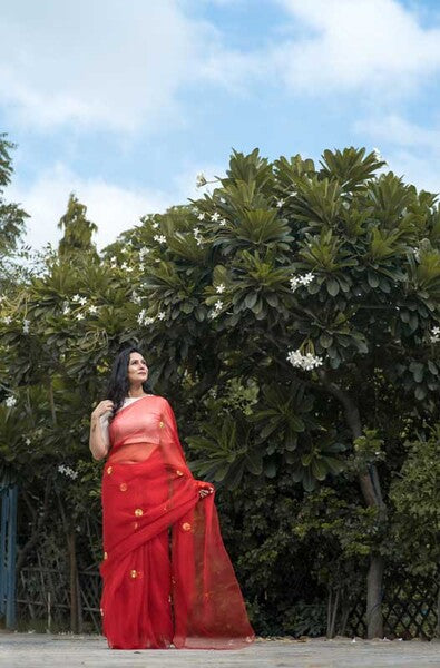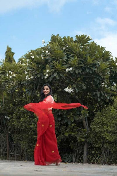 Surkh Red Saree made in pure organza. Highlighted with gota phool. This saree comes with a matching blouse in pure crepe.