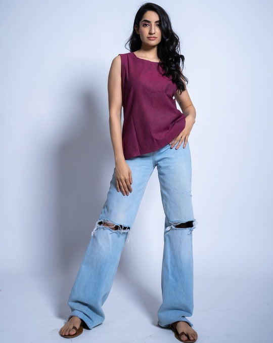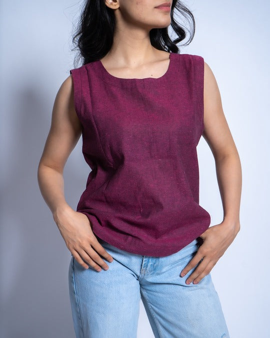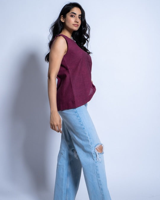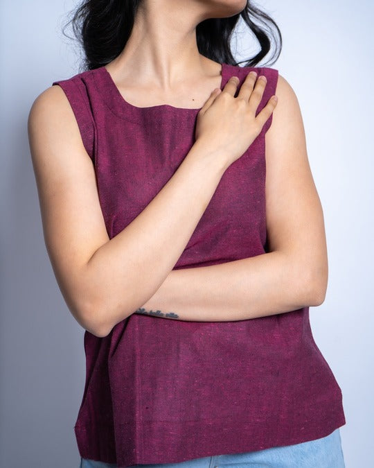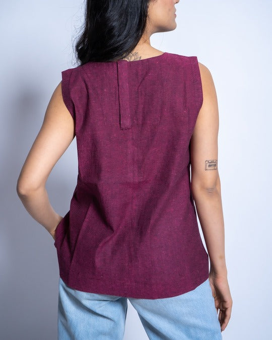 An easy sleeveless top in lightweight cotton. Blanket stitch detailing around the neckline and armhole.