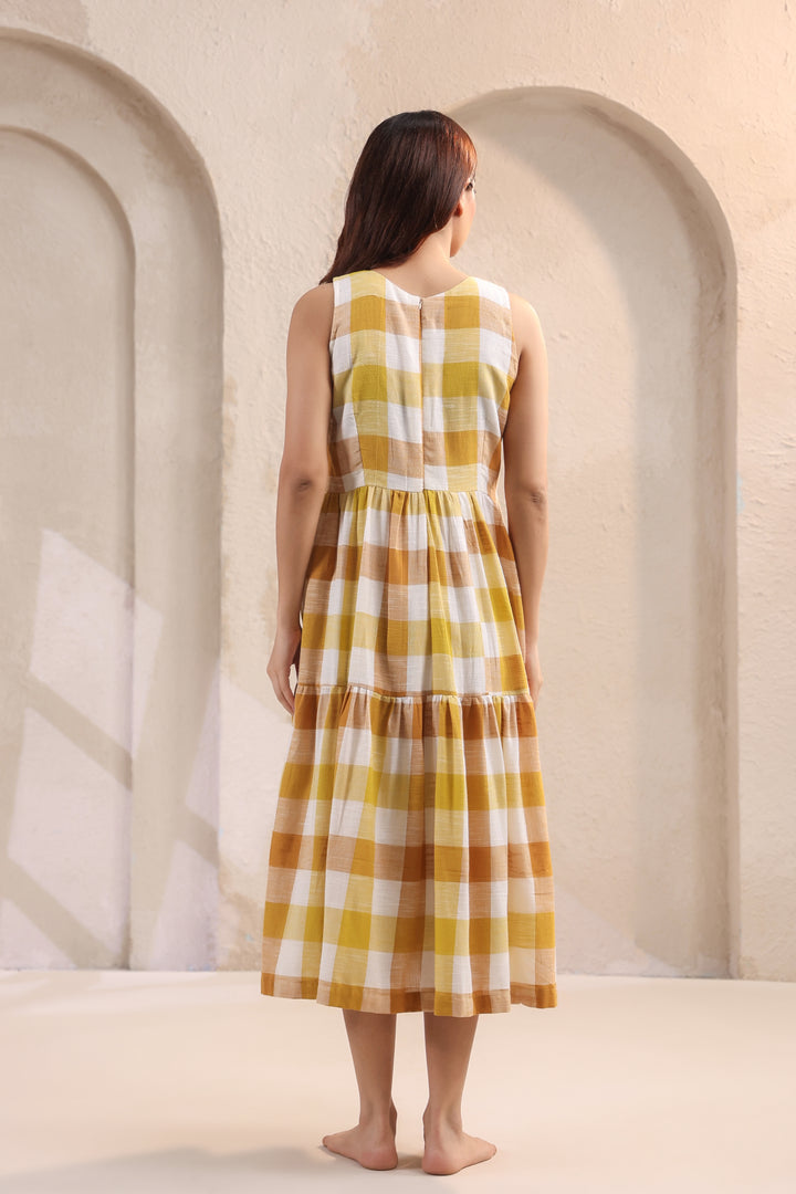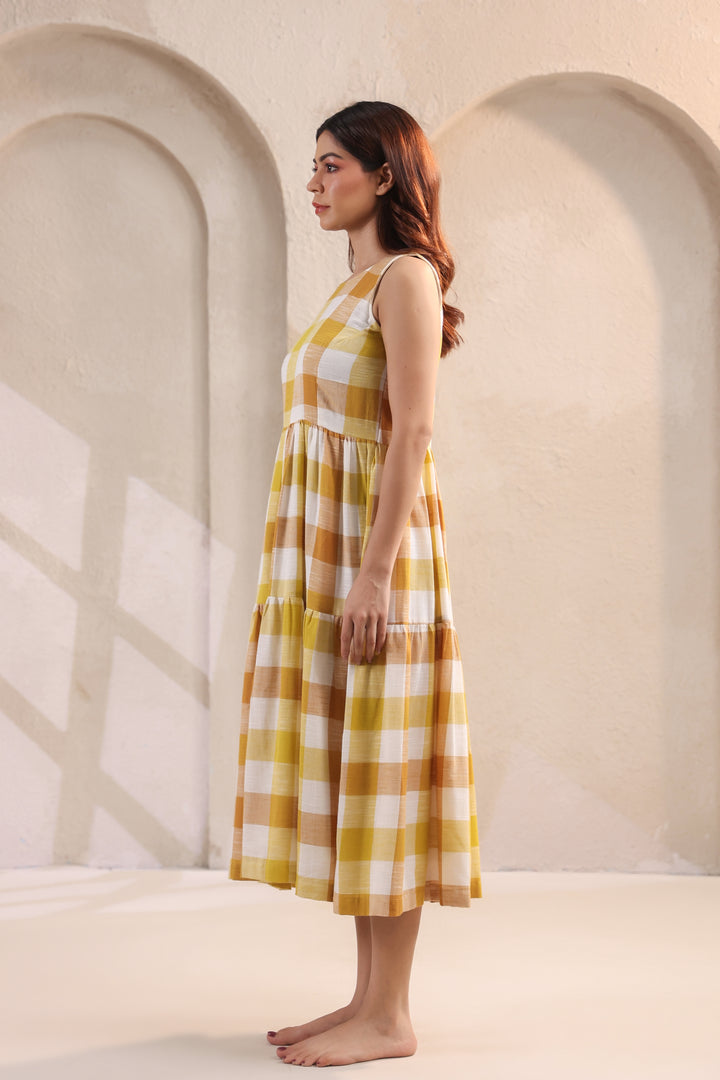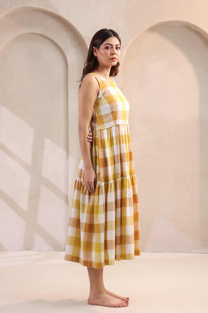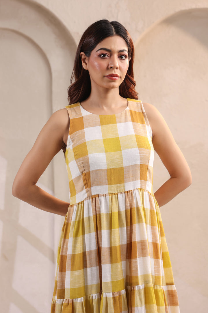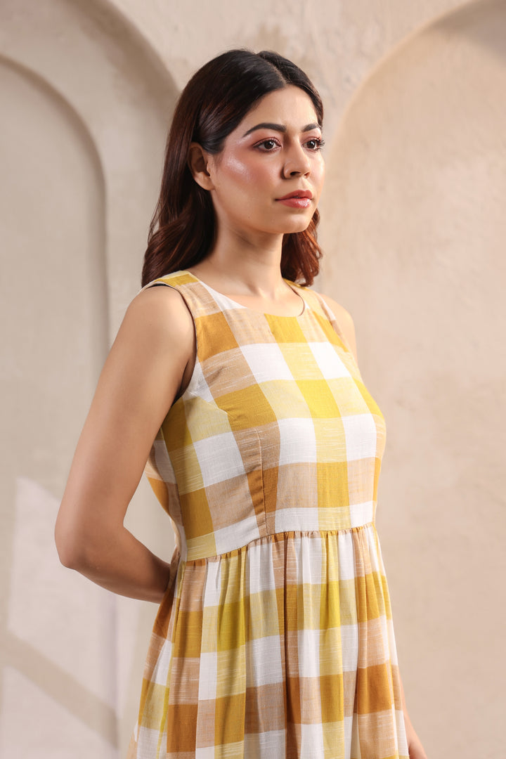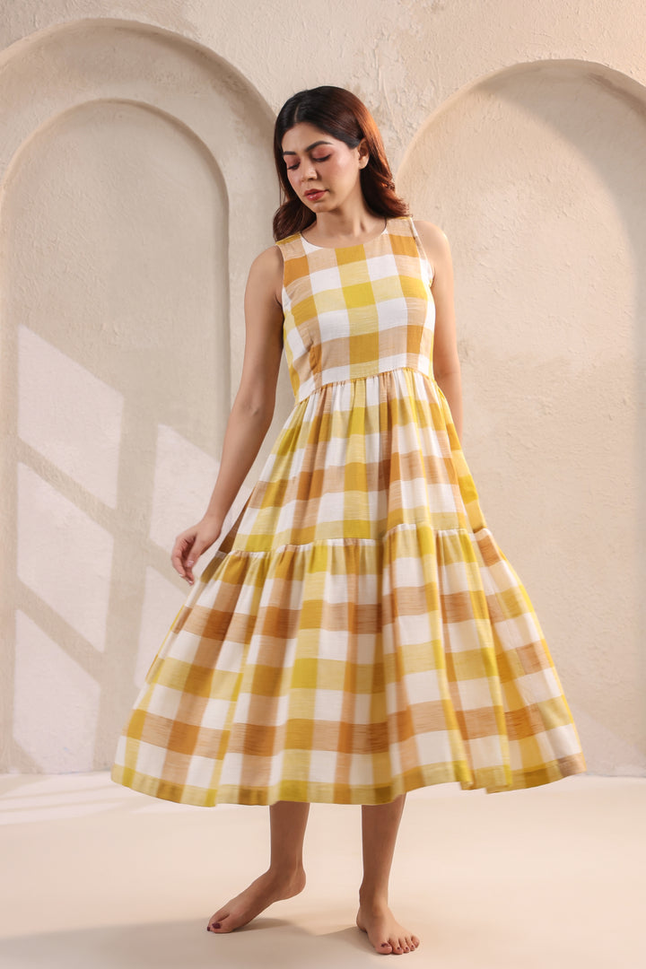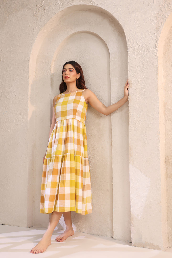 A flowy long dress in fresh yellow and white checks, designed with panels for ease and movement. Light, breezy, and perfect for sunny days.