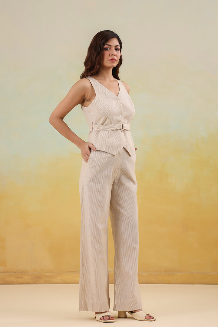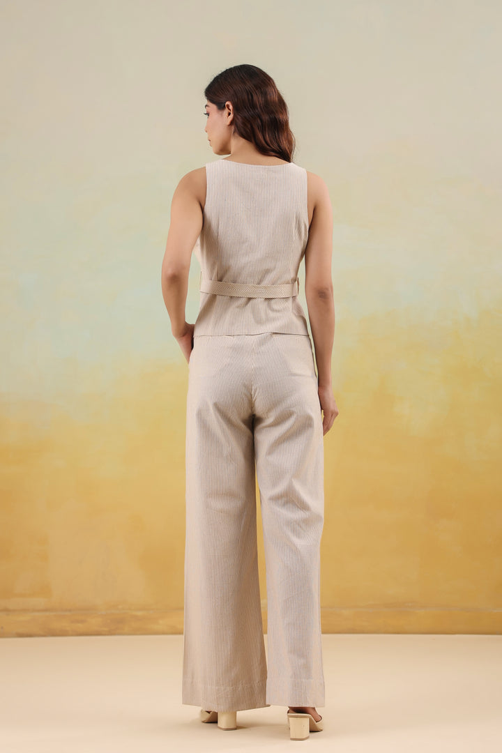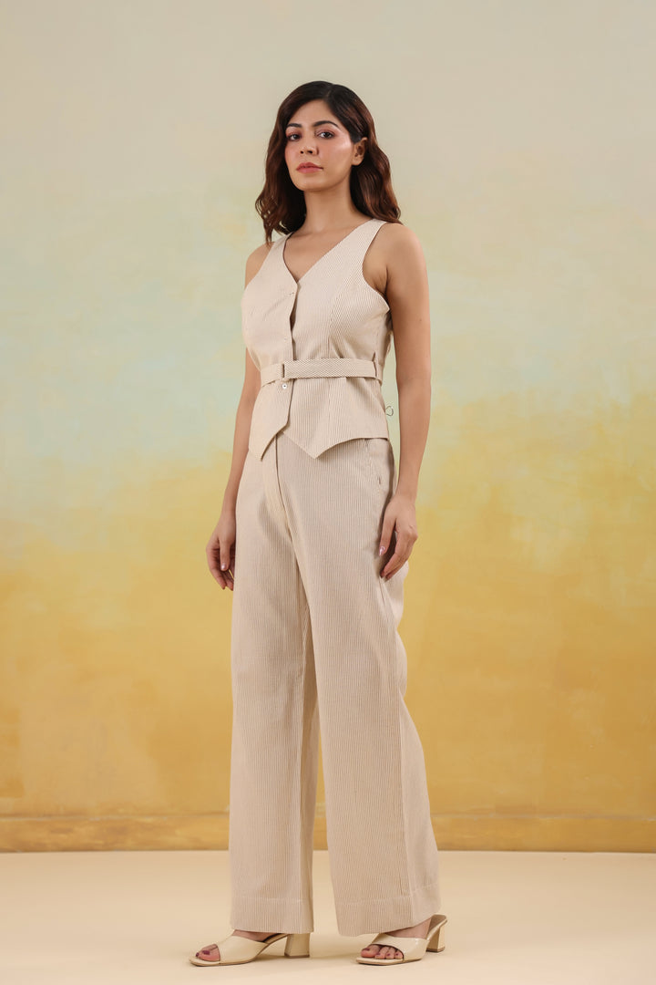 Soft and sophisticated, this co-ord set features a waistcoat-style top paired with matching pants in crisp white, elevated with gentle stripes. The tailored waistcoat silhouette adds structure, while the subtle stripes bring a touch of effortless charm. Lightweight and versatile, it’s perfect for work, brunch, or evenings when you want comfort wrapped in elegance.